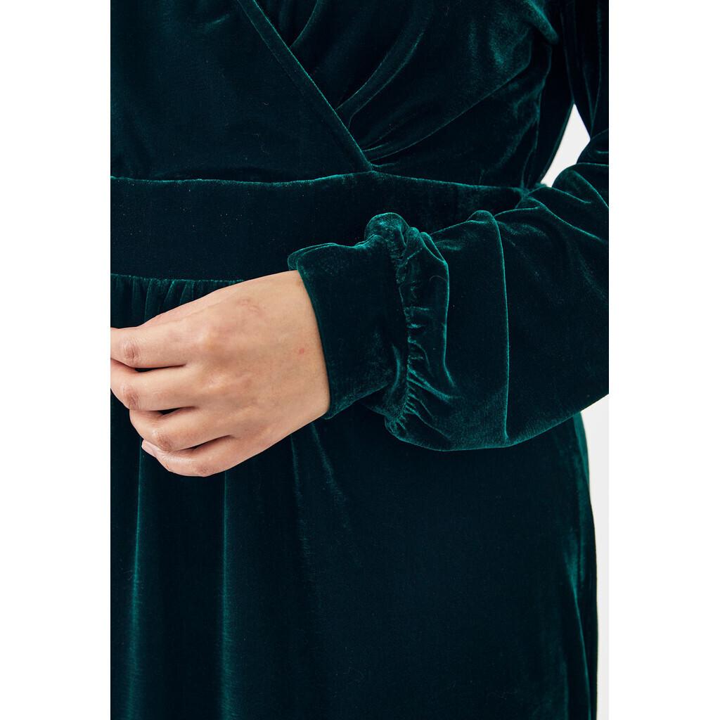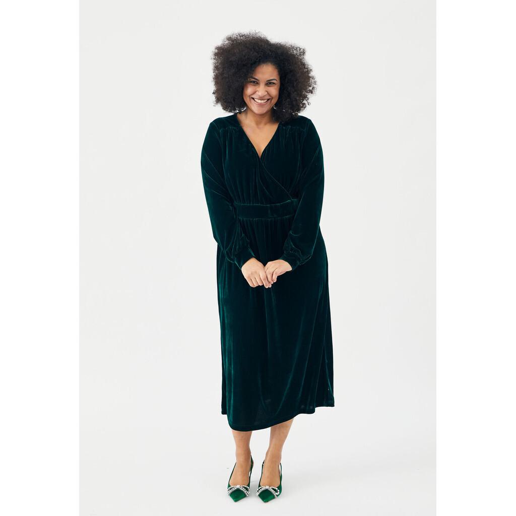 Nydelig kjole med omslag rundt bysten, innfelt bånd i midjen. Lange ermer med linning nederst. XS tilsvarer nok str 40/42.