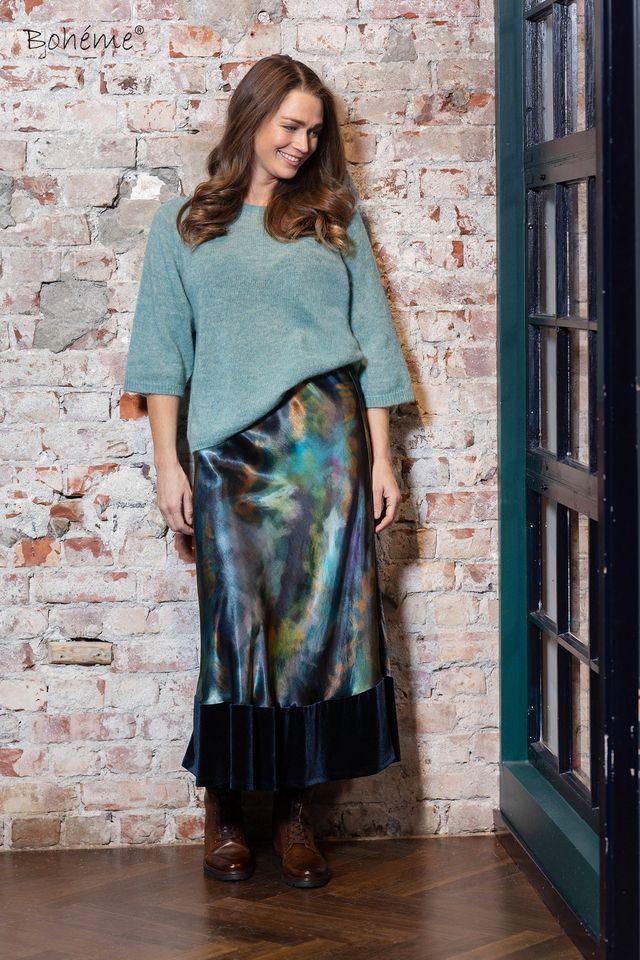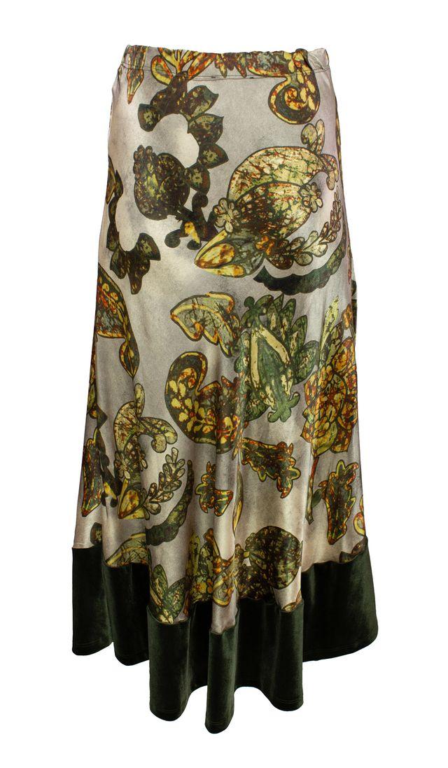 Lekkert, feminint skjørt i et nydelig print. Bred fløyelskant nede.