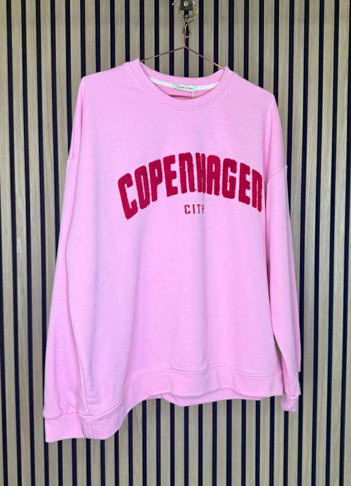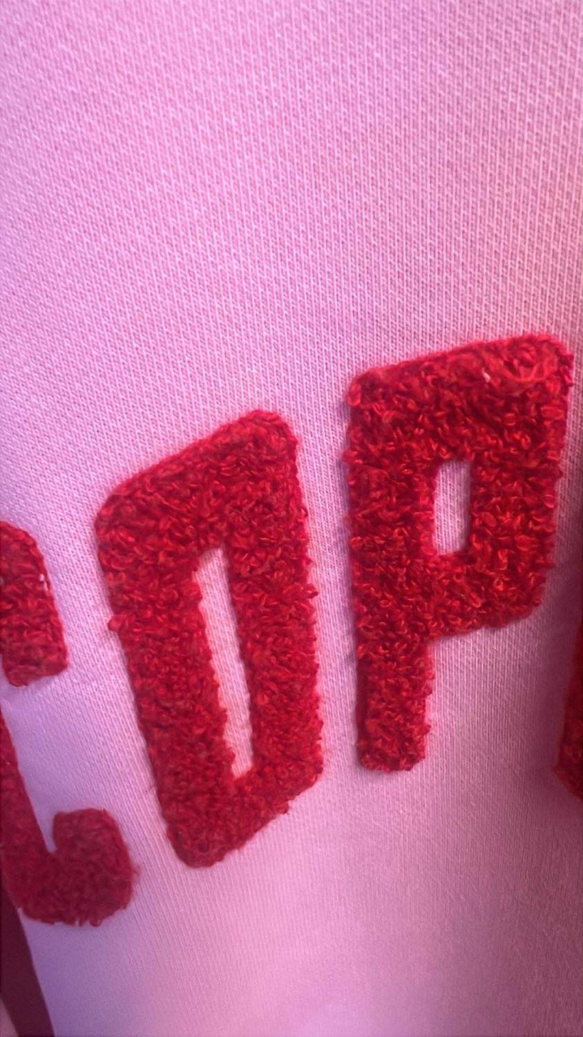 En fantastisk lekker rosafarge med flosset rød skrift.