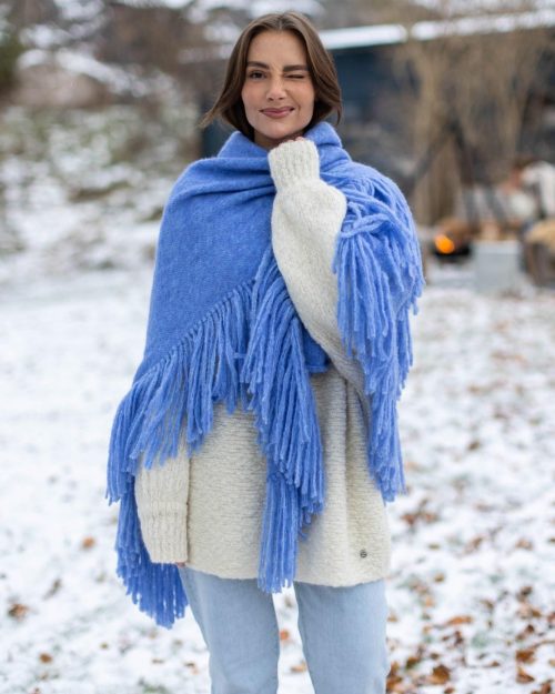 Er man uheldig og søler på sjalet, så vask bort med en fuktig klut. Garnet tåler vann. Det bør alikevel renses pga alle frynsene og for at de skal holde seg pene.