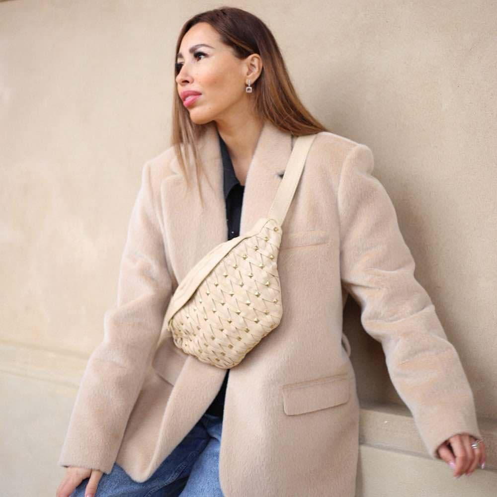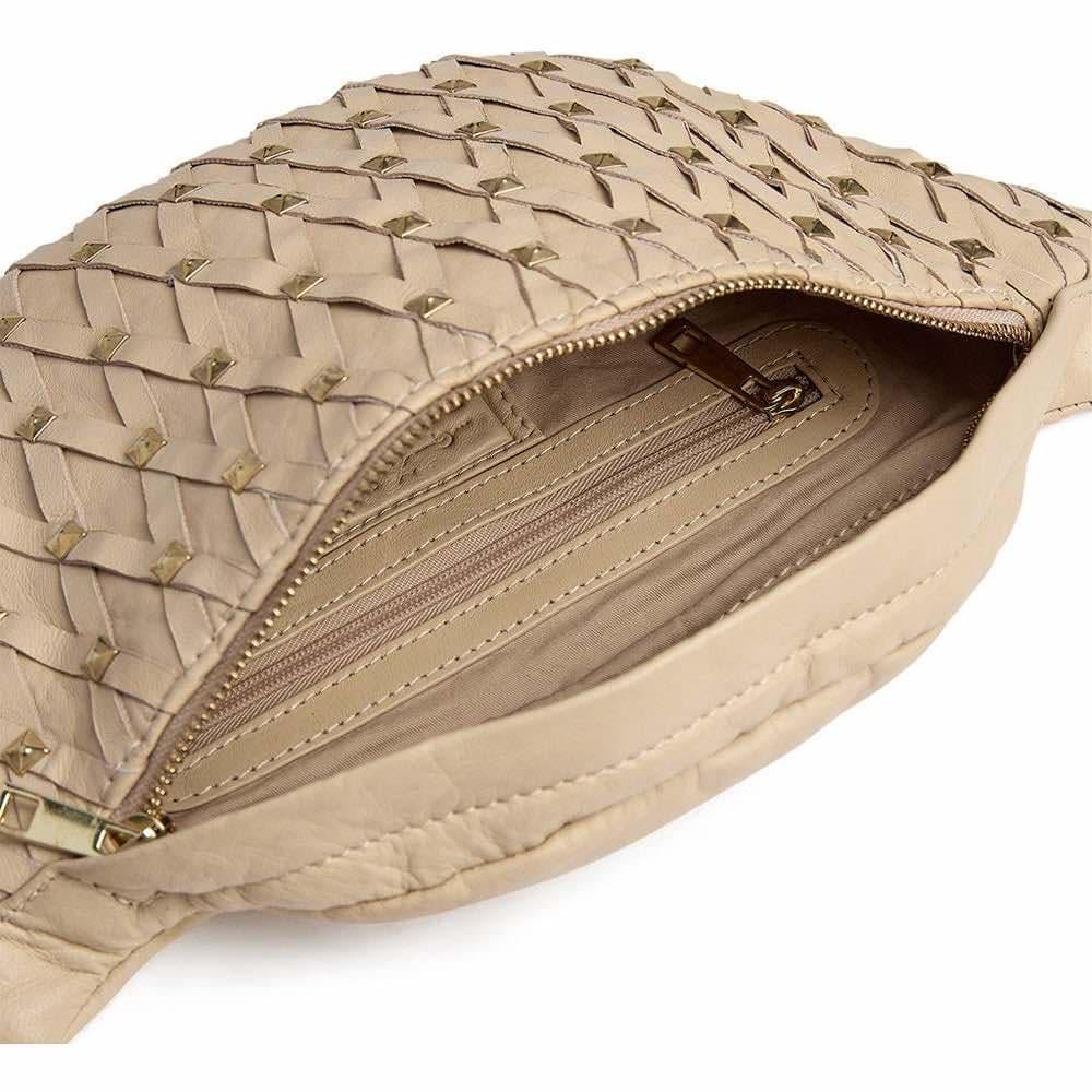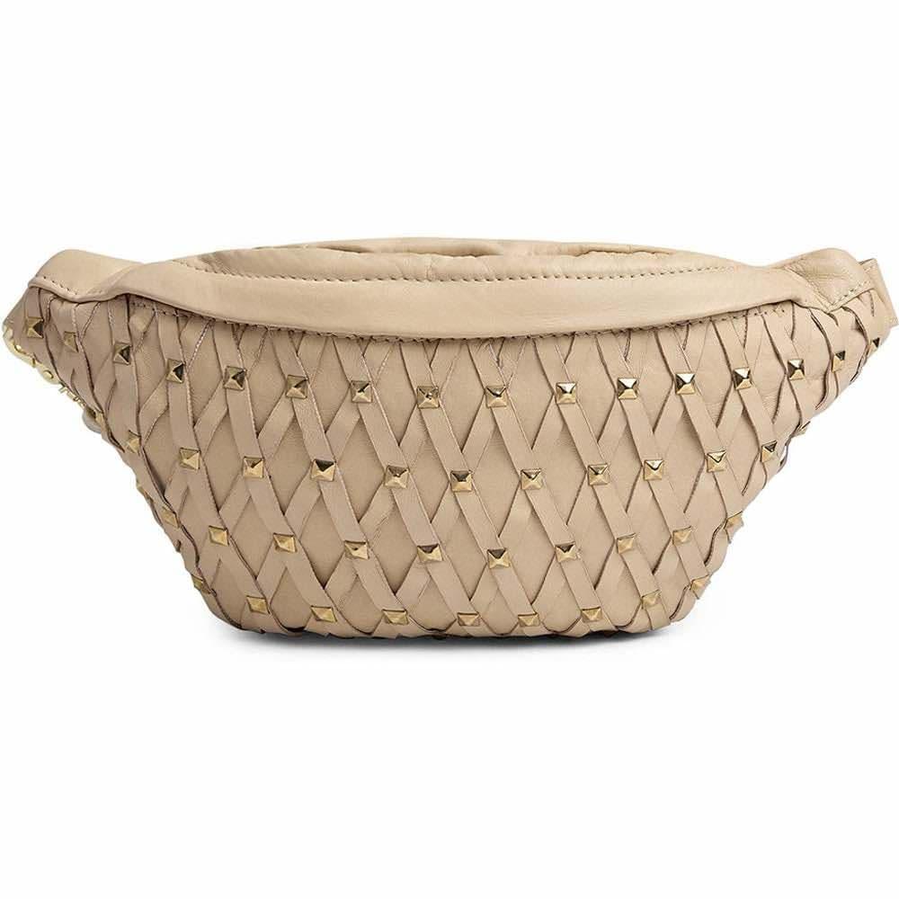 Denne bumbagen er både chic og funktionell, perfekt til hverdag, sommerens festivaler og ferier. Vesken er dekoreret med gullfargede nagler, som gir den et kantet, men sofistikert look. Detaljene i skinnet krysser hverandre på en lekker måte, og tilfører ekstra eleganse til den iøyenfallende vesken.