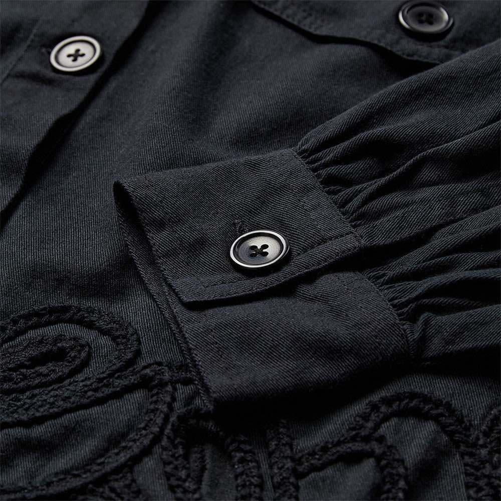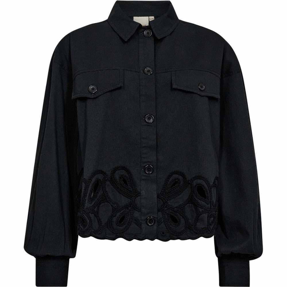Med en løs passform gir jakken en avslappet og moderne silhuett, mens de lange ermene og knappeåpningen fremhever det tidløse designet. Med to brystlommer kombinerer jakken funksjonalitet med eleganse.Den eksklusive dekobåndet på kanten, pyntet med store “blonder” detaljer, gir et feminint og luksuriøst utseende, noe som gjør den til et iøynefallende valg.