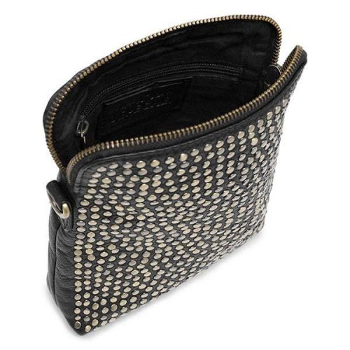 Mobilveske i en fin, deilig og myk skinnkvalitet. Vesken har en ekstra detalj i form av de mange naglene, som gir et kult og rått utseende. Den lukkes øverst med glidelås.
