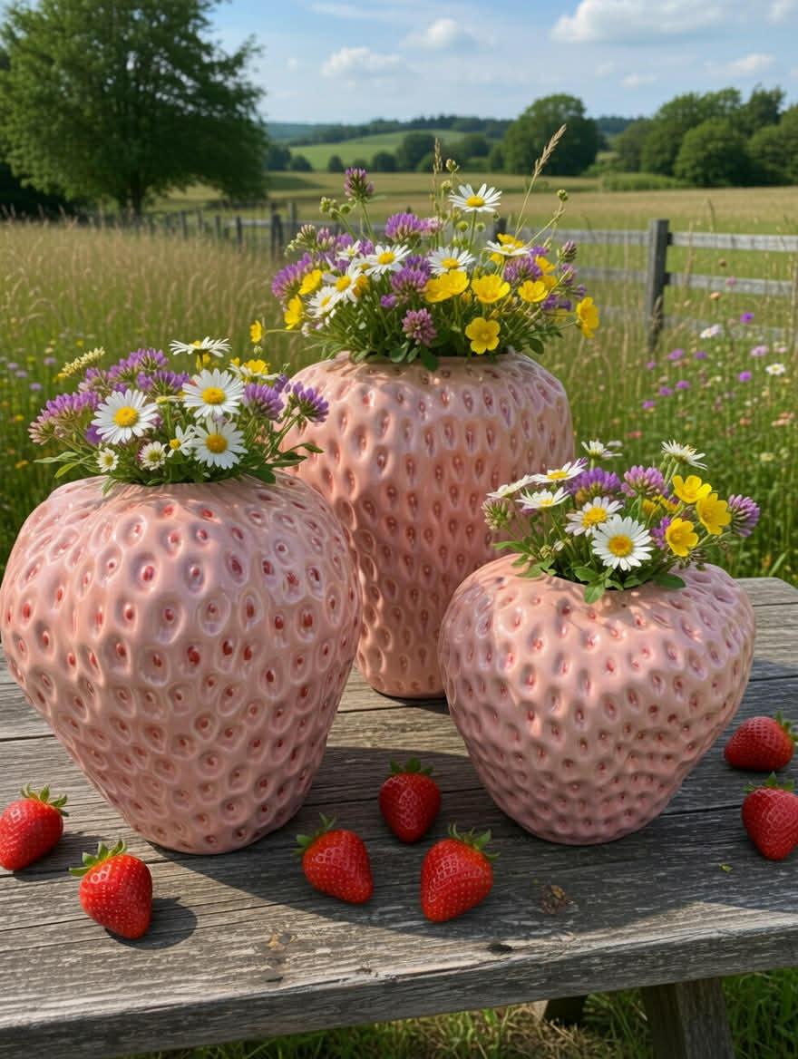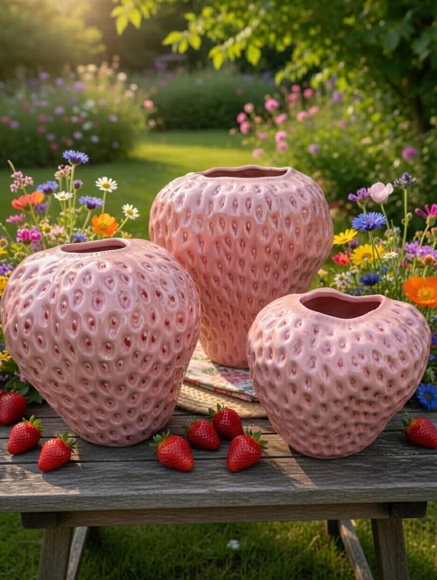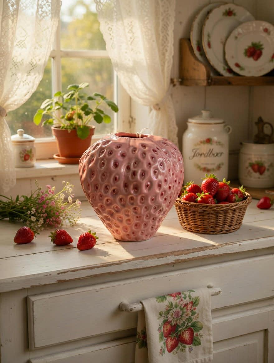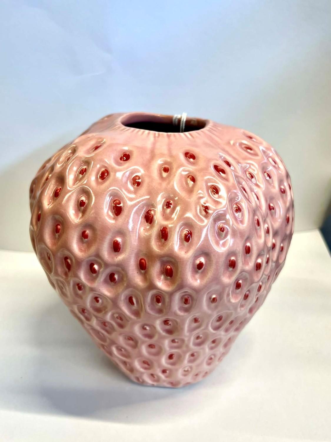 Vi elsker disse jordbærvasene fra EDG som kommer i tre størrelser- Formet som et jordbær og er like dekorative med eller uten innhold.
