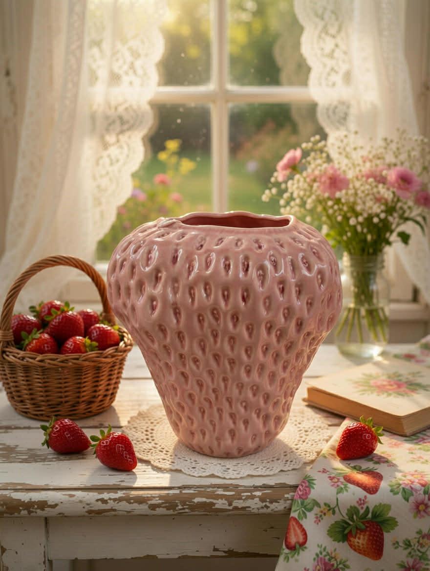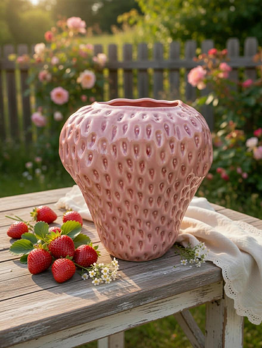 Vi elsker disse jordbærvasene fra EDG som kommer i tre størrelser- Formet som et jordbær og er like dekorative med eller uten innhold.
