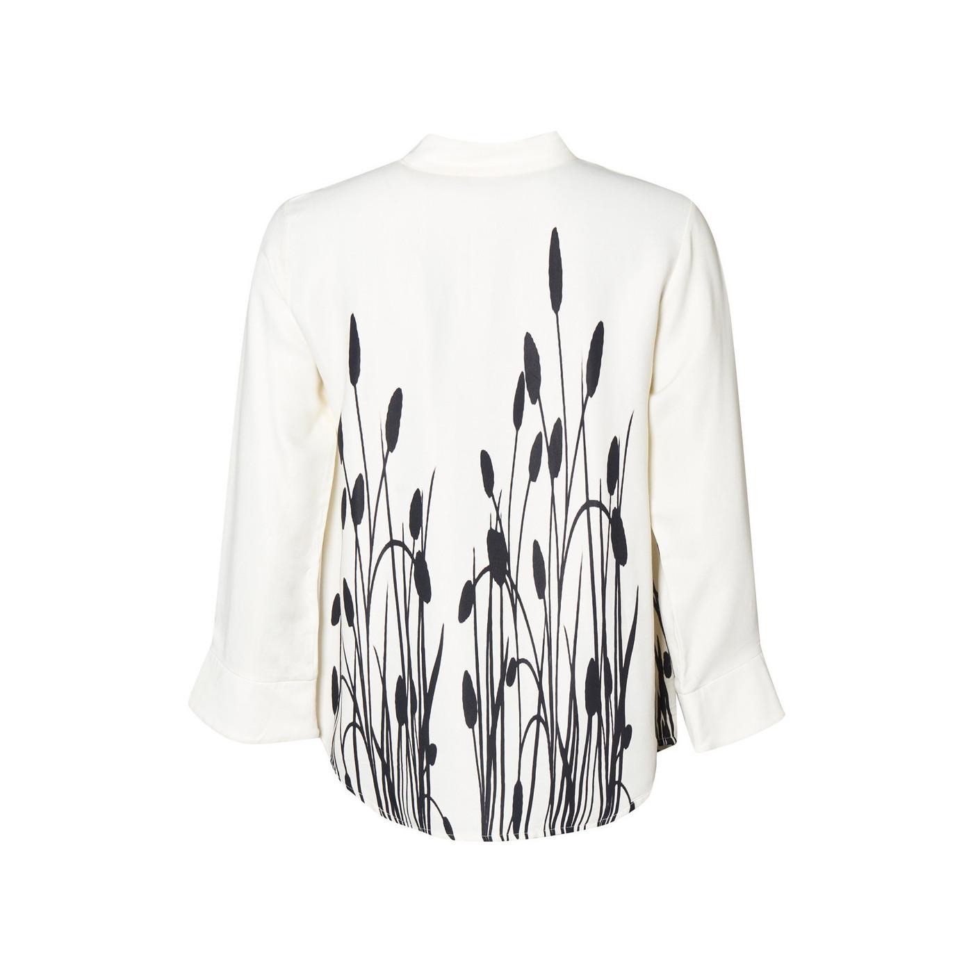 En feminin blouse med en kunstnerisk touch, designet i et lett, glatt stoff som faller vakkert. Stilen har en avslappet A-form, en liten ståkrage med V-hals, og 3/4-lange ermer med en myk flair. Et plassert trykk nederst gir et moderne og eksklusivt utseende.