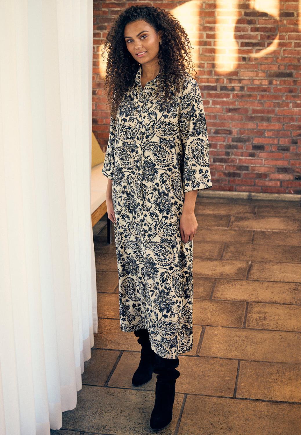 Elegant kjole med et klassisk blomstermønster. Med sin feminine passform og 3/4 ermer er kjolen perfekt til både hverdags og spesielle anledninger. Kjolen har knapperekke foran og lommer i siden.