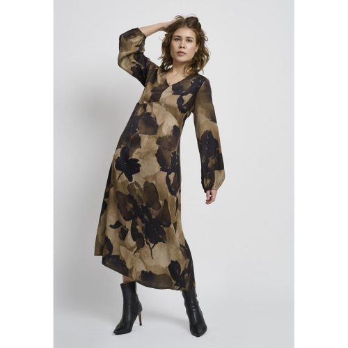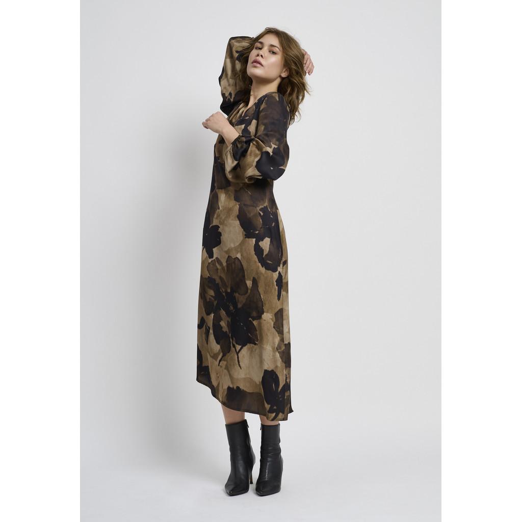 Den lette viskosen faller naturlig langs kroppen, noe som gir kjolen en luftig overflate som fremhever dens sofistikerte design. Med sitt iøynefallende trykk er det en stil som skiller seg ut – men som samtidig beholder tidløs sjarm.