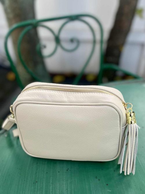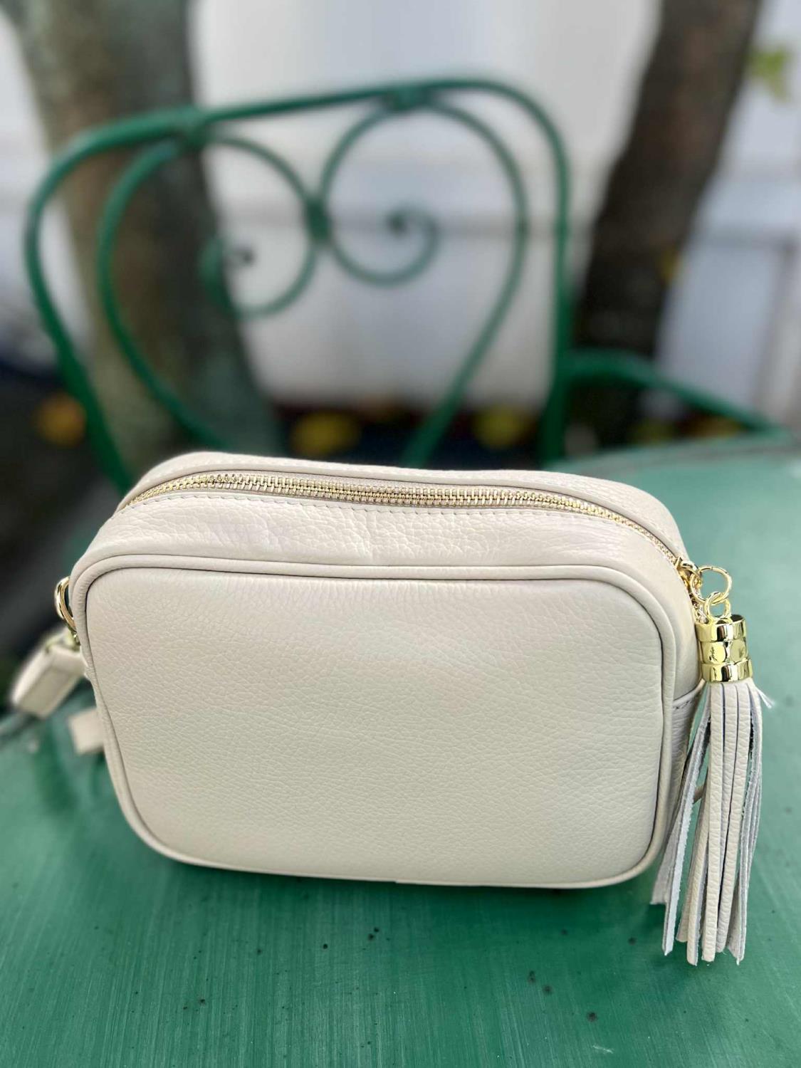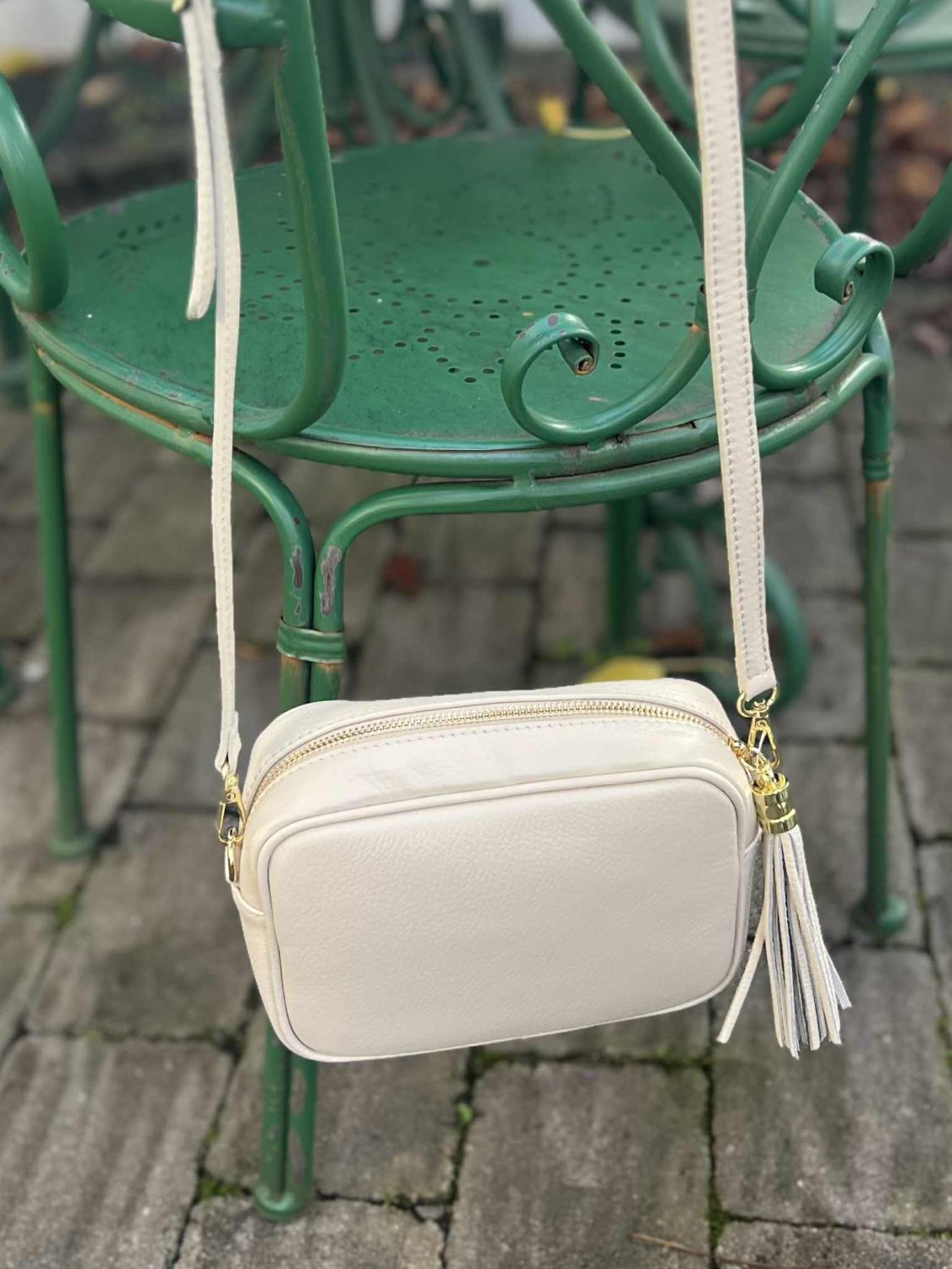 Lekker beige veske. Den har pyntedusk festet til glidelås. Liten lomme inni.