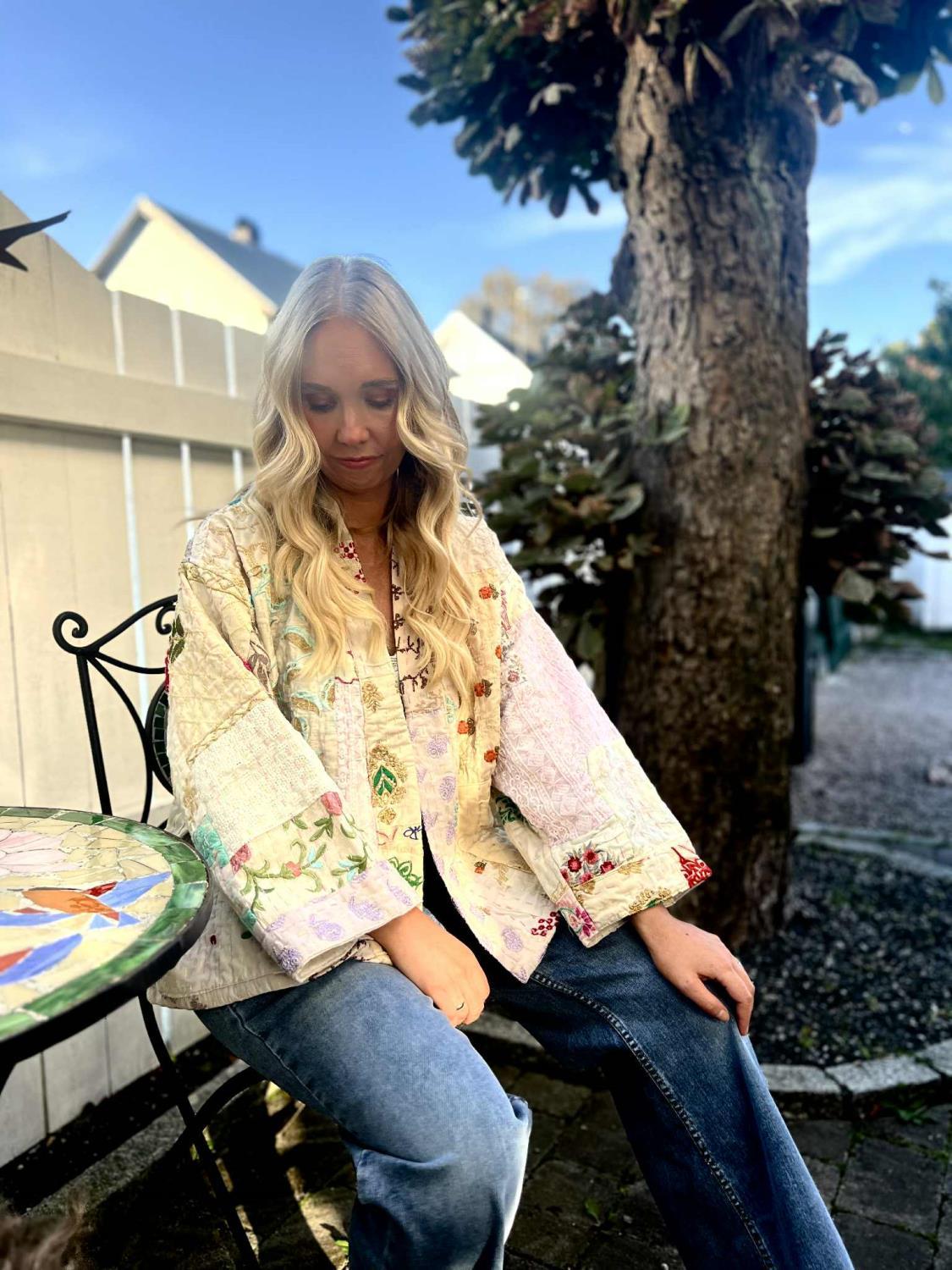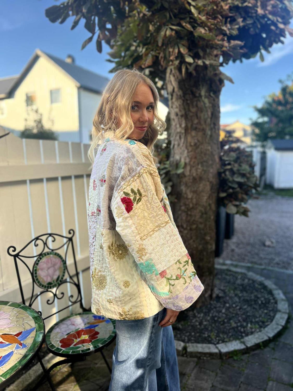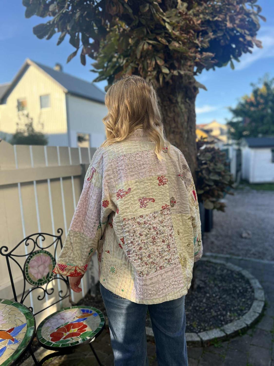 Den vakreste quiltede jakke fra vårt unike merke Wauw. Jakken er åpen uten knapper, men har med et løst belte. Den har 2 påsydde lommer. Ermene er 3/4 lange. Jakka har de vakreste broderier, og den er er unik da ingen er like. Hver jakke er sydd sammen av vakre indiske stoffer.