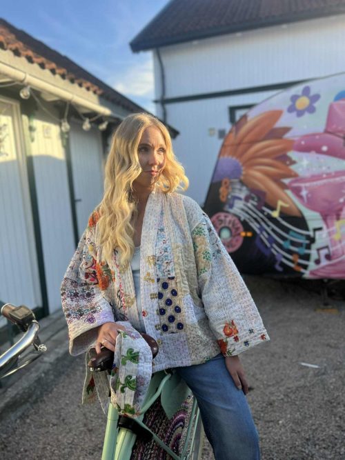 Den vakreste quiltede jakke fra vårt unike merke Wauw. Jakken er åpen uten knapper, men har med et løst belte. Den har 2 påsydde lommer. Ermene er 3/4 lange. Jakka har de vakreste broderier, og den er er unik da ingen er like. Hver jakke er sydd sammen av vakre indiske stoffer.