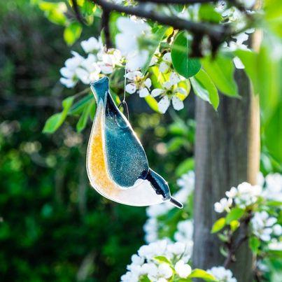 Vakker fugl i glass fra danske Glas & Glimt. Spettmeisen symboliserer intelligens, Konkurransedyktighet og stedfasthet.