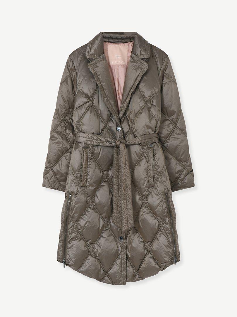 Lekker quiltet kåpe i A-shape med store metall trykk knapper. Glidelås i begge sider, belte i livet.