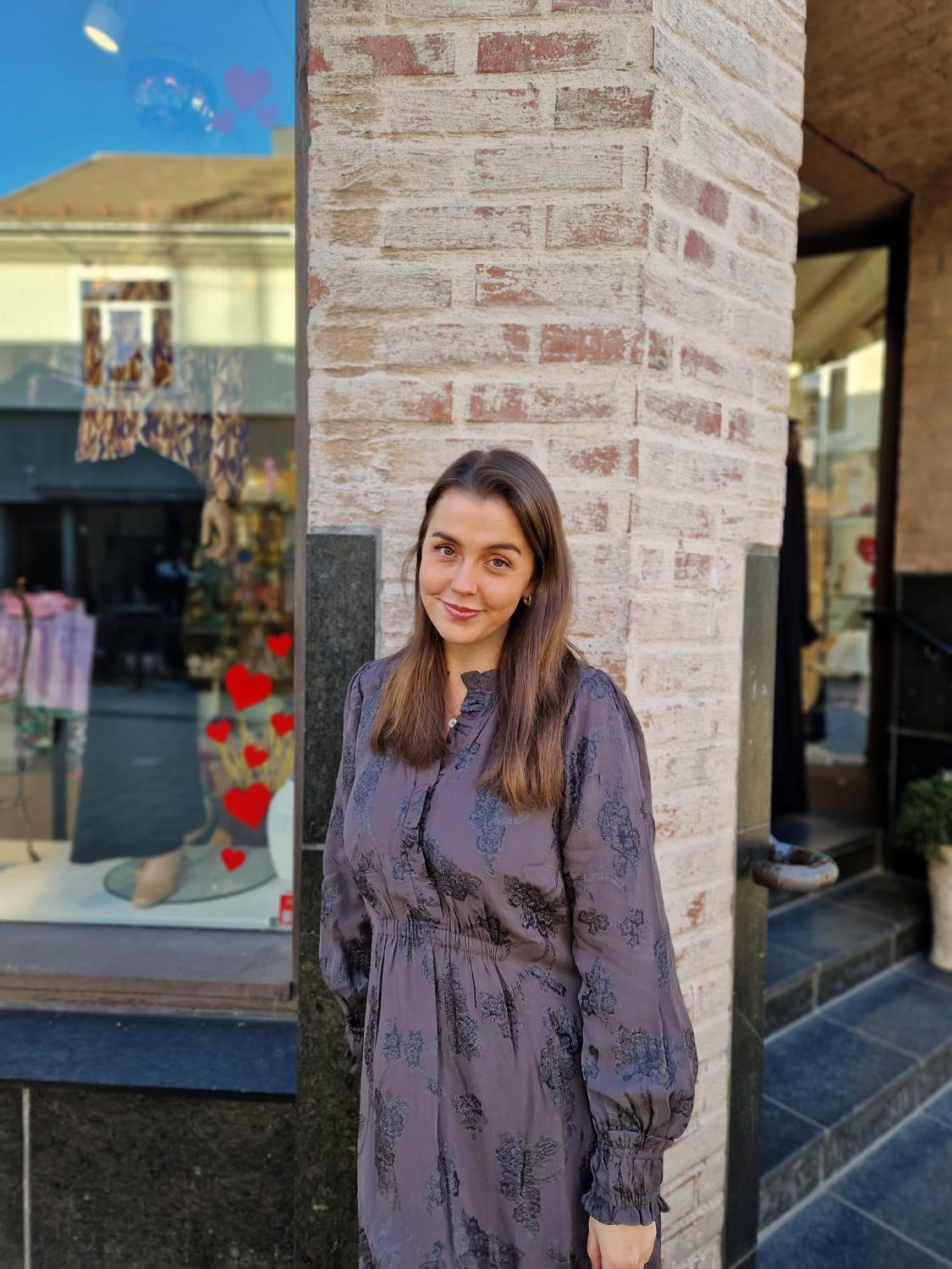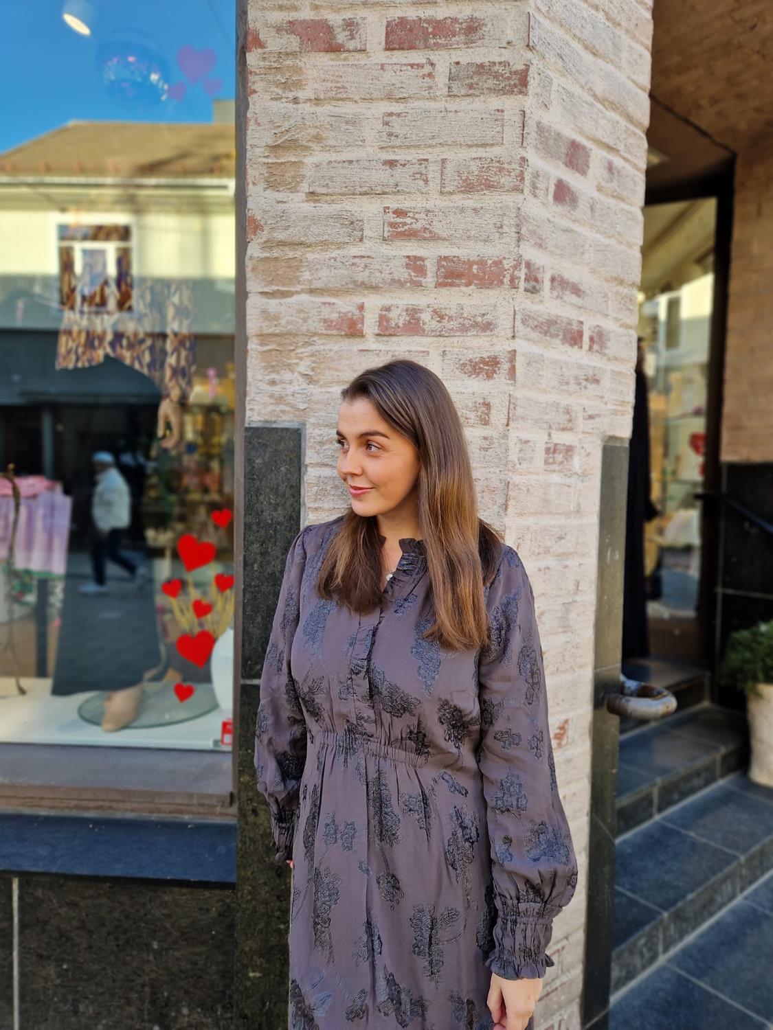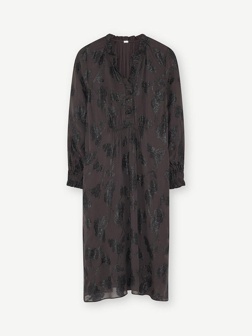Lekker kjole med v/hals, lange ermer med vaffelstrikk nederst. Rysjekant rundt hals og ned til midjen.