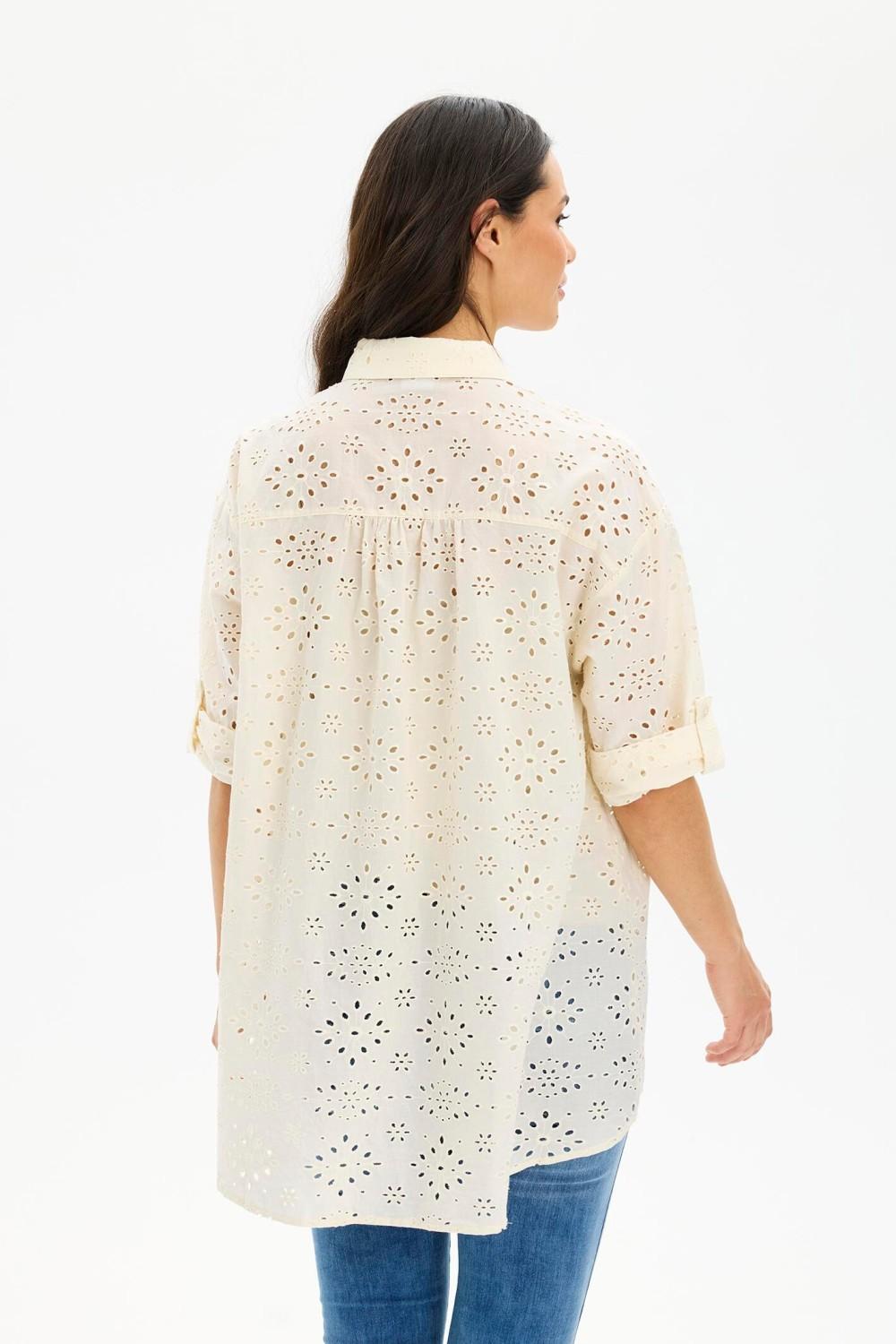 Vakker skjorte fra IN FRONT med engelsk broderi. Knappelukking foran og lengre bærestykke med legg bak. Fin og feminin bluse til de fleste anledninger.