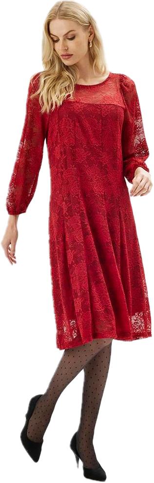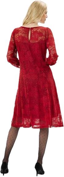 Det er smale folder foran på kjolen og en kledelig huskebredde på skjørtet. Mykt blondemateriale. En allsidig kjole som er flott til fest.