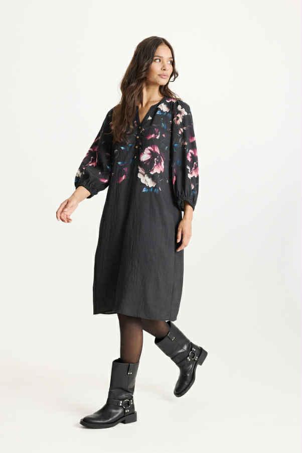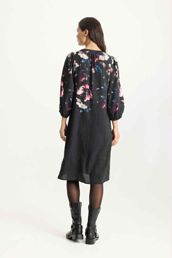 Nydelig kjole med et vakkert blomstermotiv i lekre farger. Den har v/hals med fire dekorative knapper. Ermene er vide, avsluttes med en strikk nederst. En lekker kjole nå utover høst/vinter.