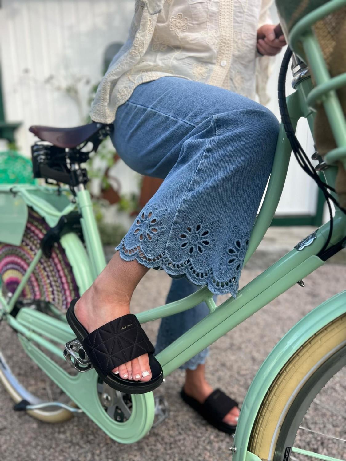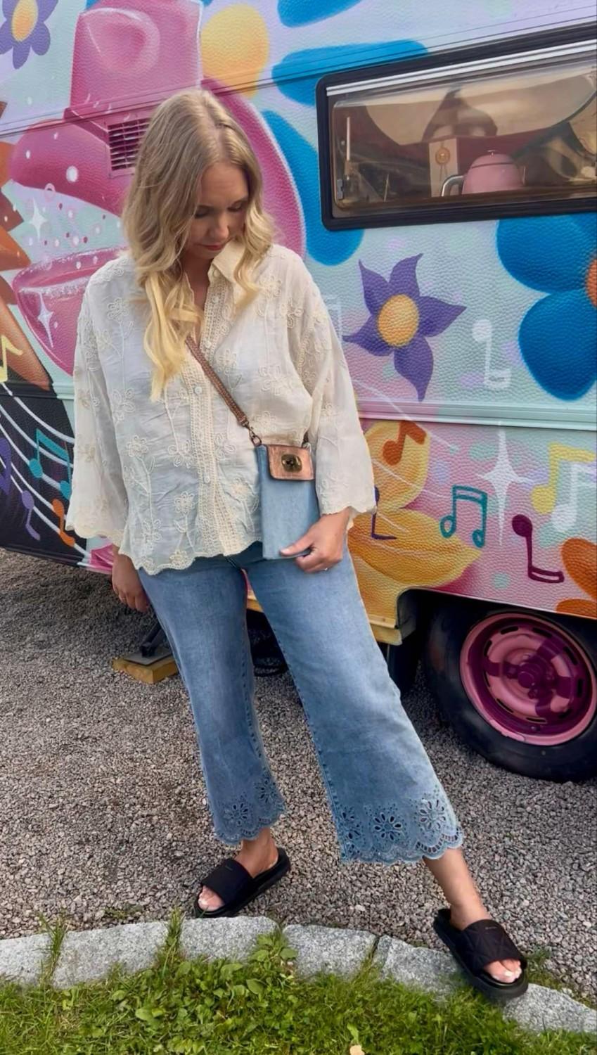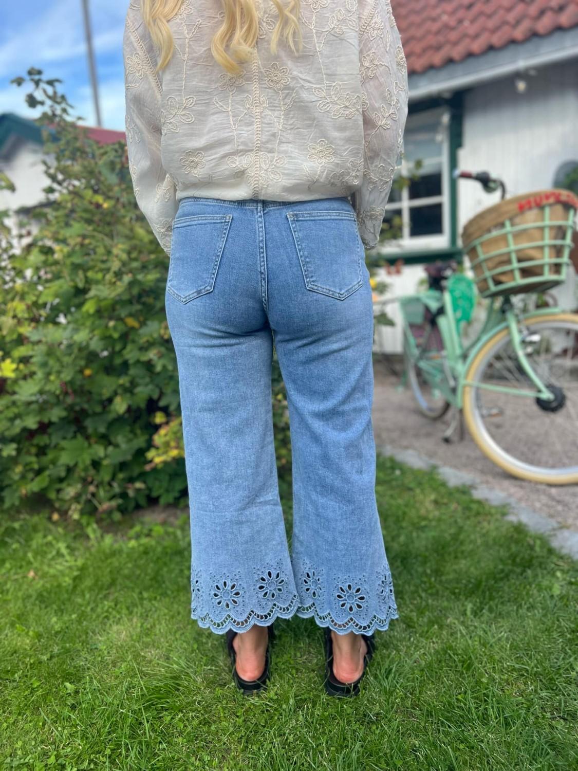 Tøff deminbukse med engelsk blondekant. Buksen har strech, to baklommer, to frontlommer og gylf med glidelås. Rett modell. Normal i størrelsen.