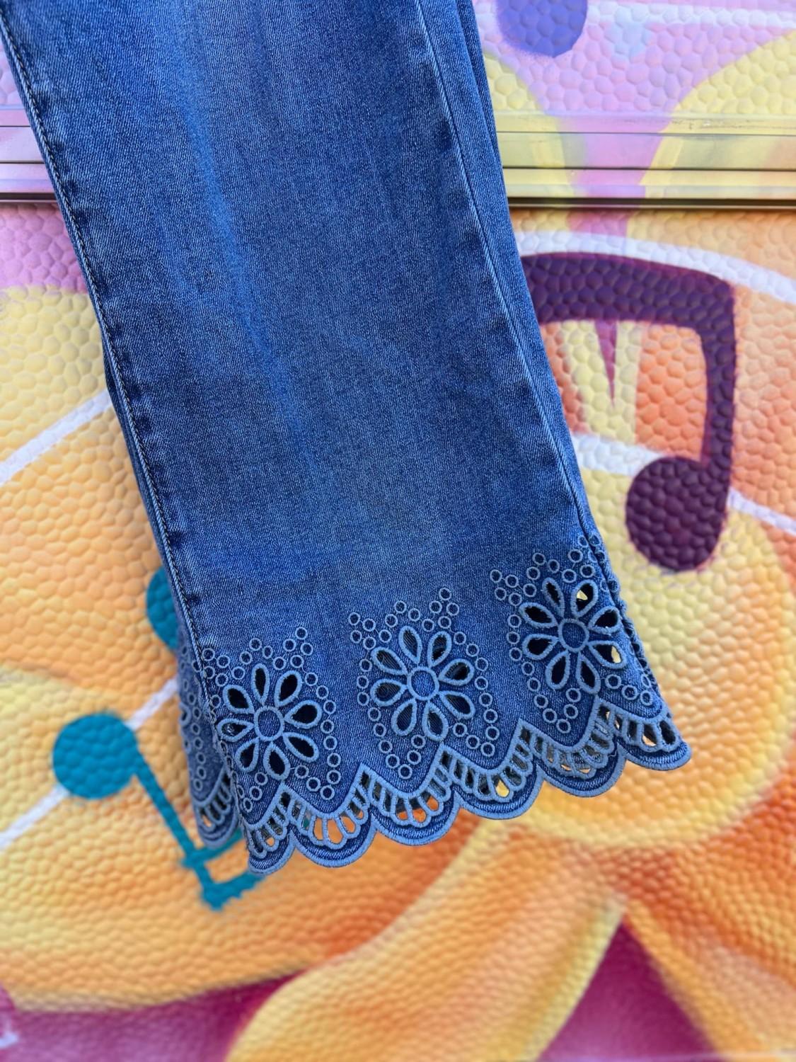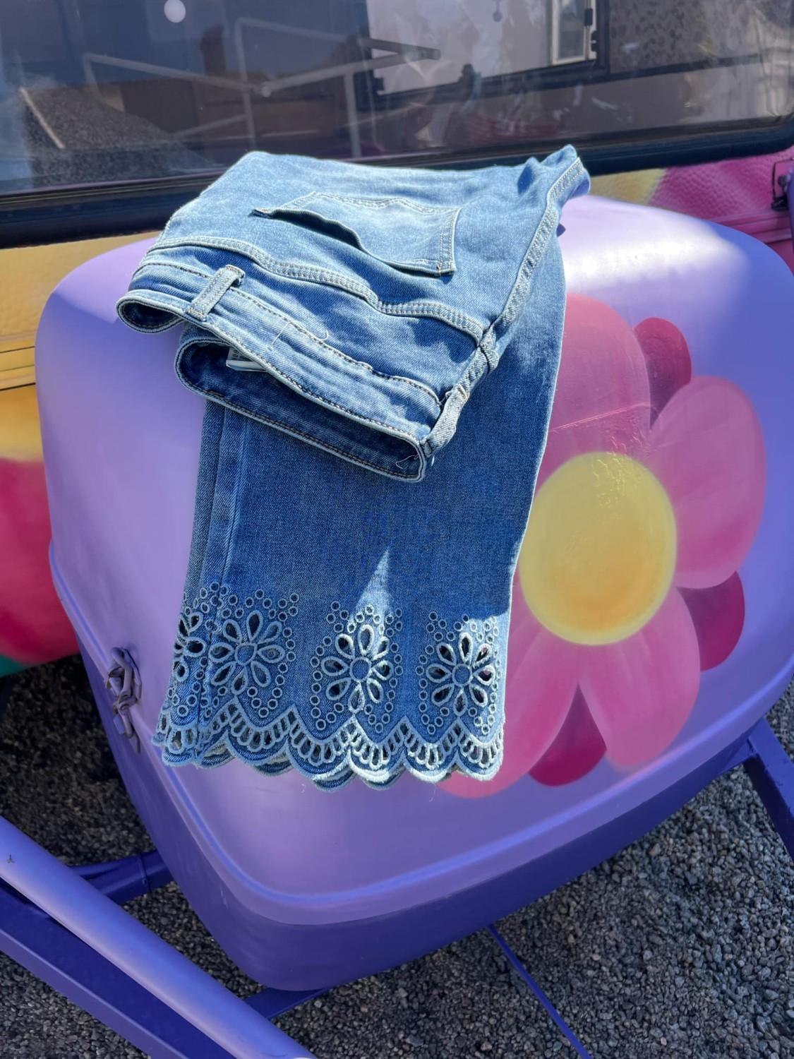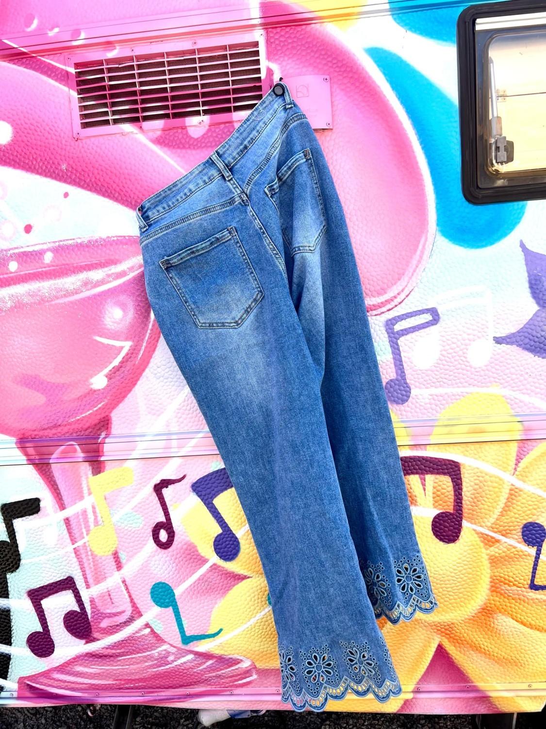 Tøff deminbukse med engelsk blondekant. Buksen har strech, to baklommer, to frontlommer og gylf med glidelås. Rett modell. Normal i størrelsen.