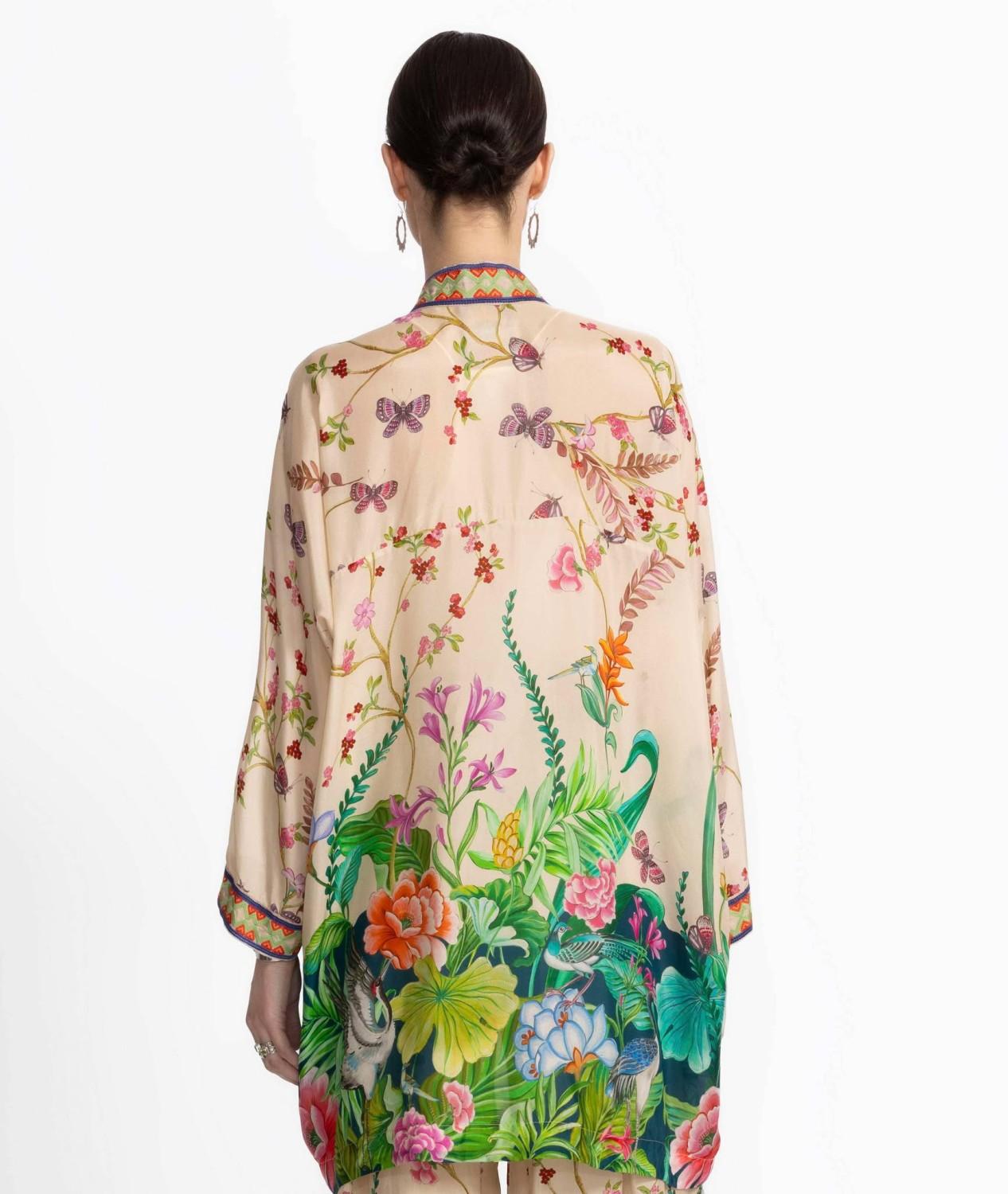 Med inspirasjon fra rike blomsterhager, har Shae Printed Kimono et levende blomstermønster forsterket med rike farger. Laget av 100% silke, har denne fantastiske kimonoen en knytelukking, lommer og en avrundet kant nede der kimonoen er lengre bak. Stor i størrelsen.