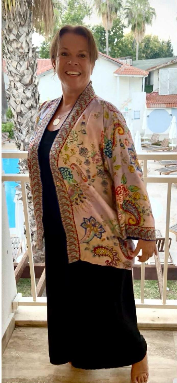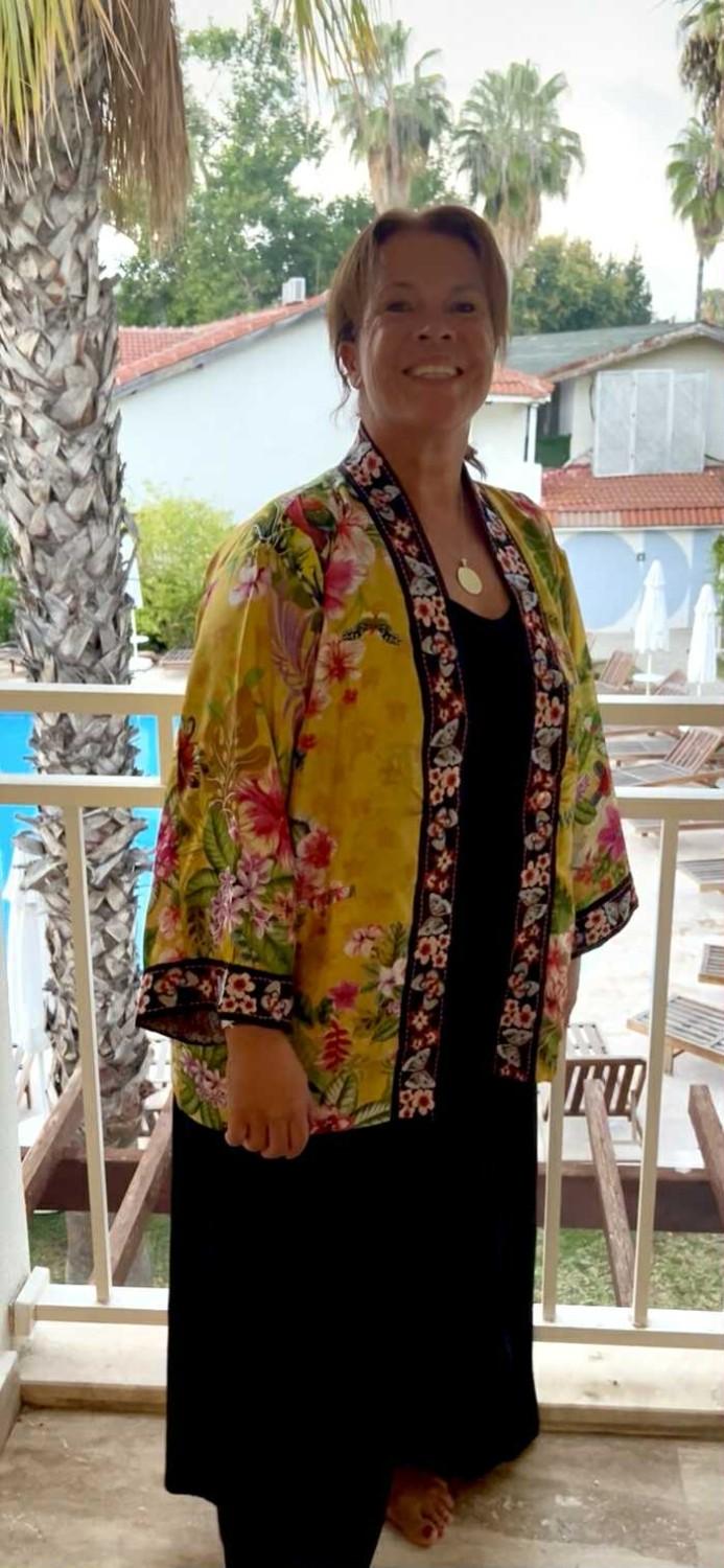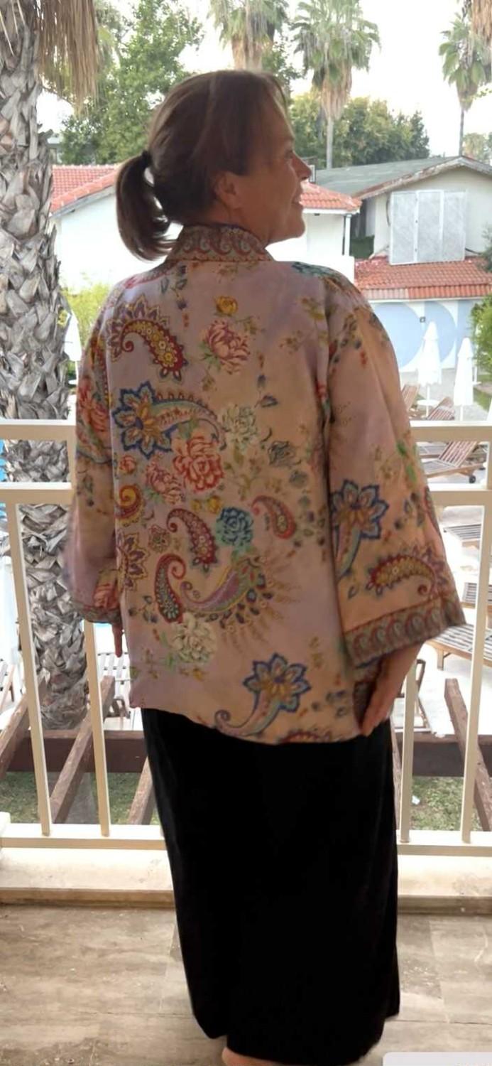 Kimonoen er i 100% silke med vakre broderier. Den er vendbar med to unike mønstre. Denne kimonoen er designet med åpen front og nedhengte skuldre, og har stikklommer, dristig broderi og kontrasterende kant.