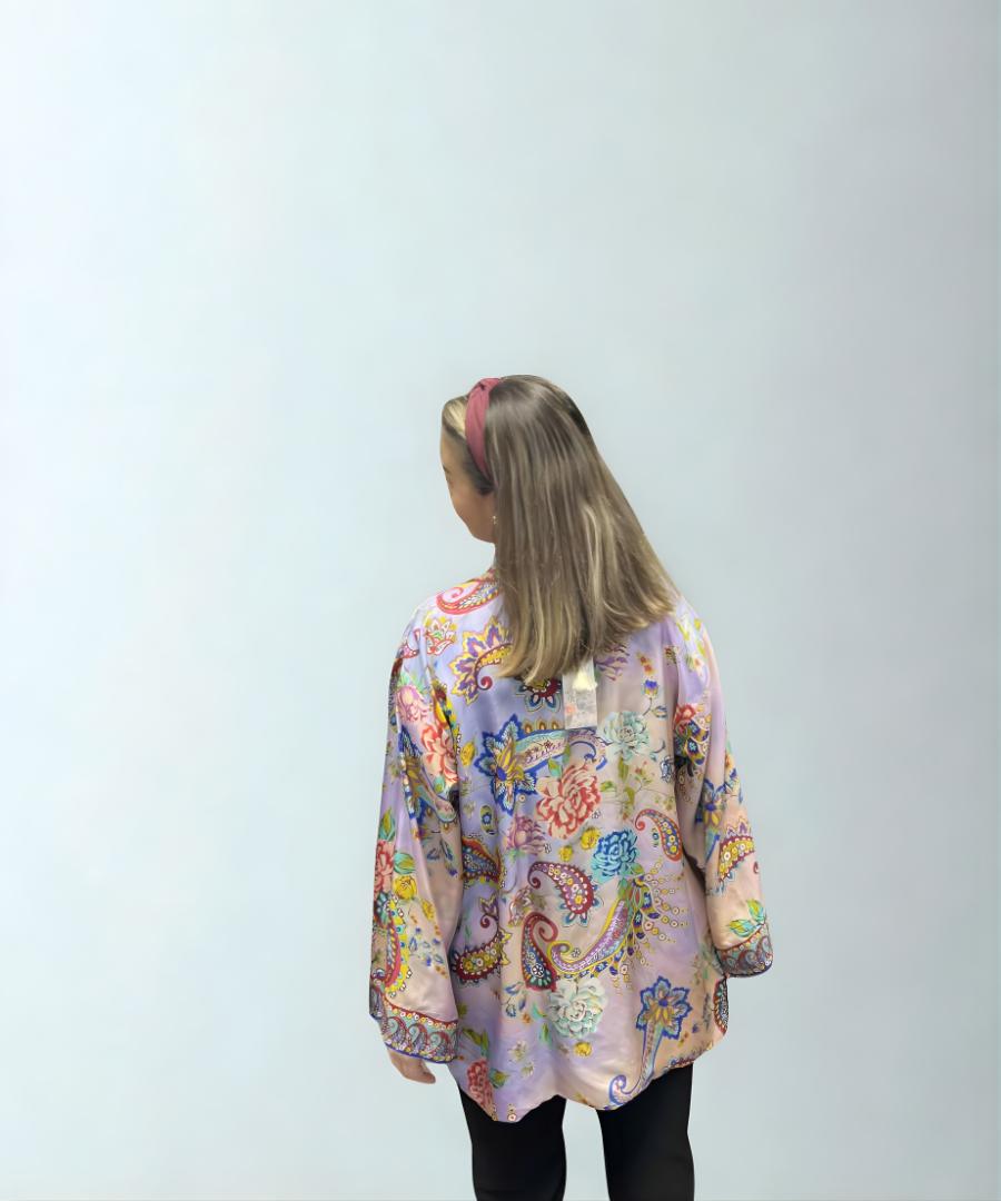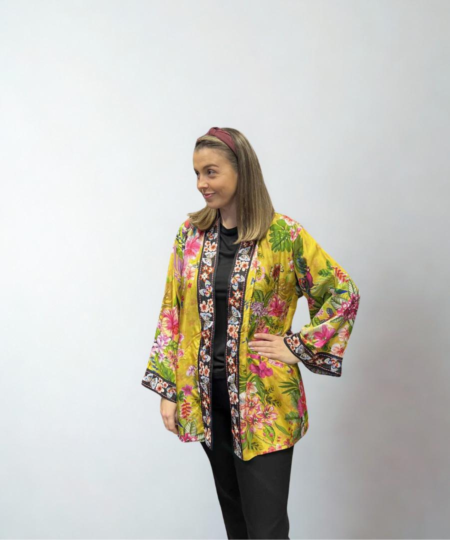 Kimonoen er i 100% silke med vakre broderier. Den er vendbar med to unike mønstre. Denne kimonoen er designet med åpen front og nedhengte skuldre, og har stikklommer, dristig broderi og kontrasterende kant.