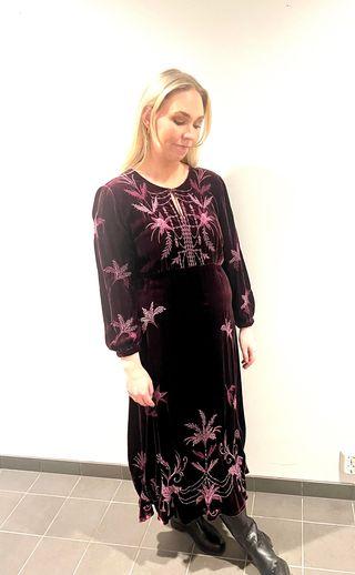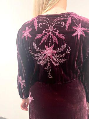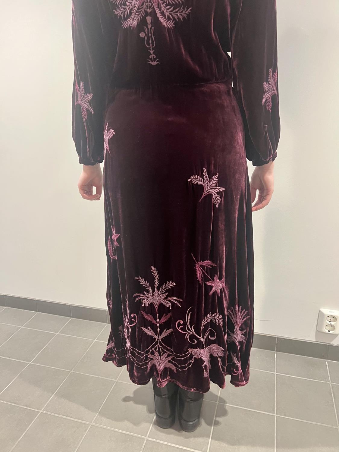 Palmira Velvet Effortless Midi Dress er laget av en overdådig silkeblanding, og lever opp til navnet sitt. Med en lettflytende A-linjesilhuett og attraktiv delt utringning, er denne fløyelsmyke kjolen utsmykket med nøye plasserte, fantastiske broderte detaljer. Et kunstverk av en kjole!