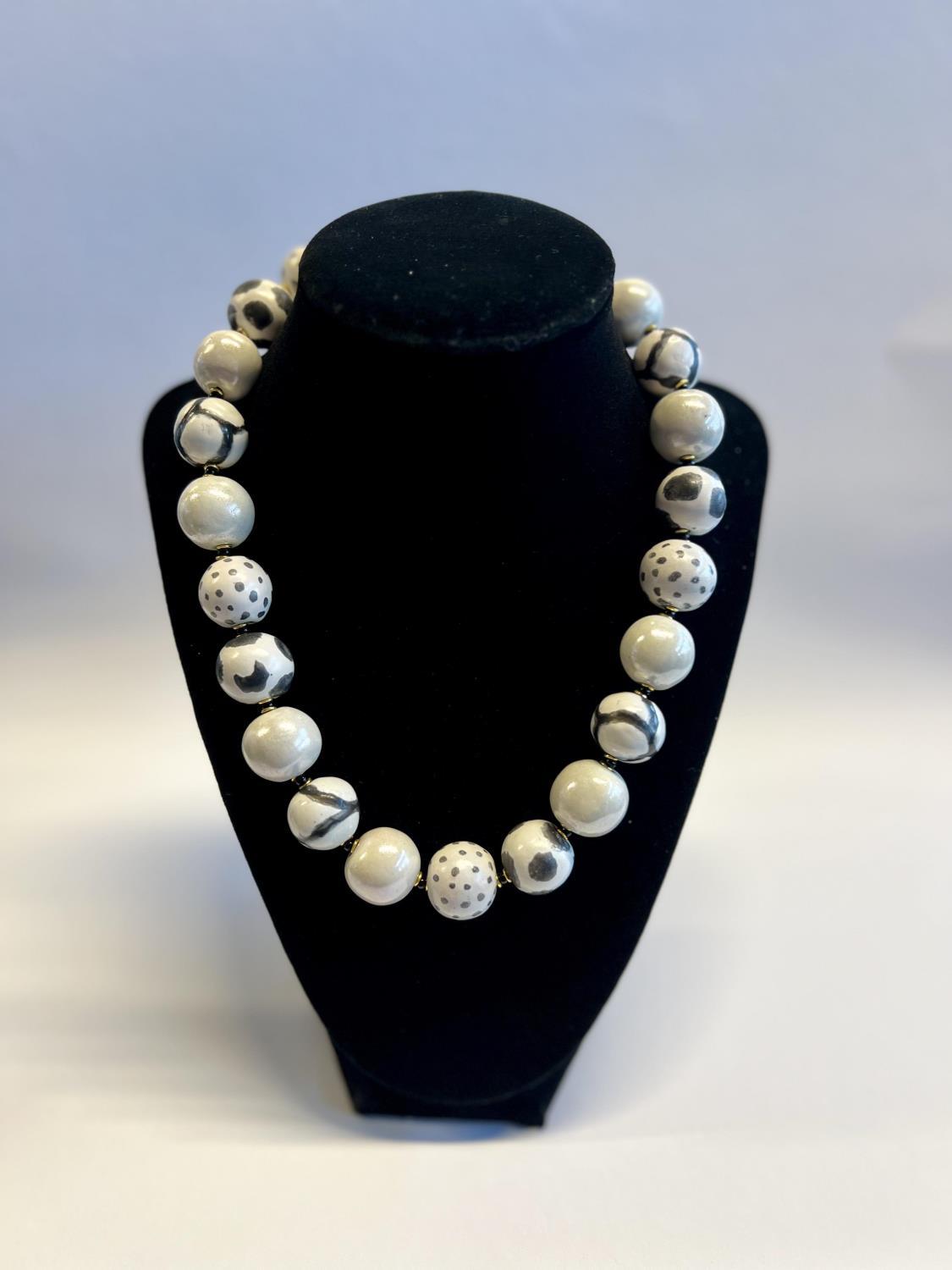 Perlene er tredd på fiskesnøre, låser samt mellomstykke er laget i forgylt kobber.
