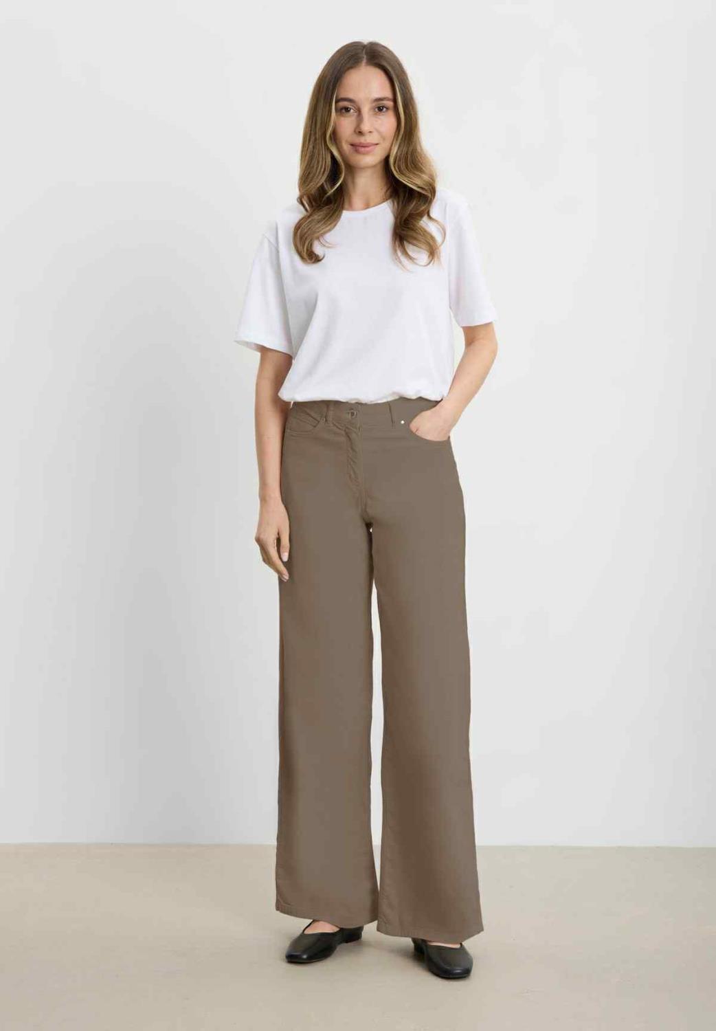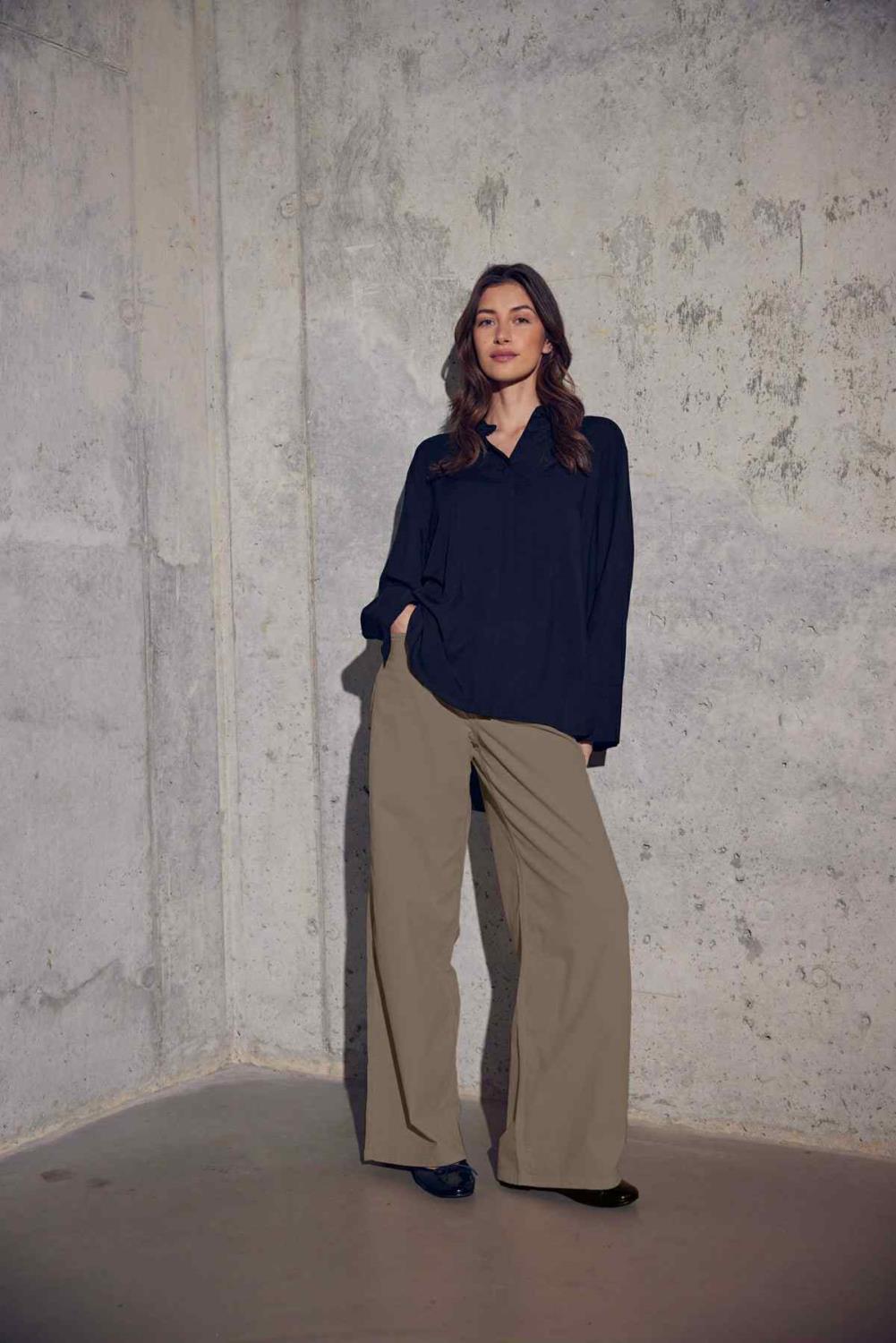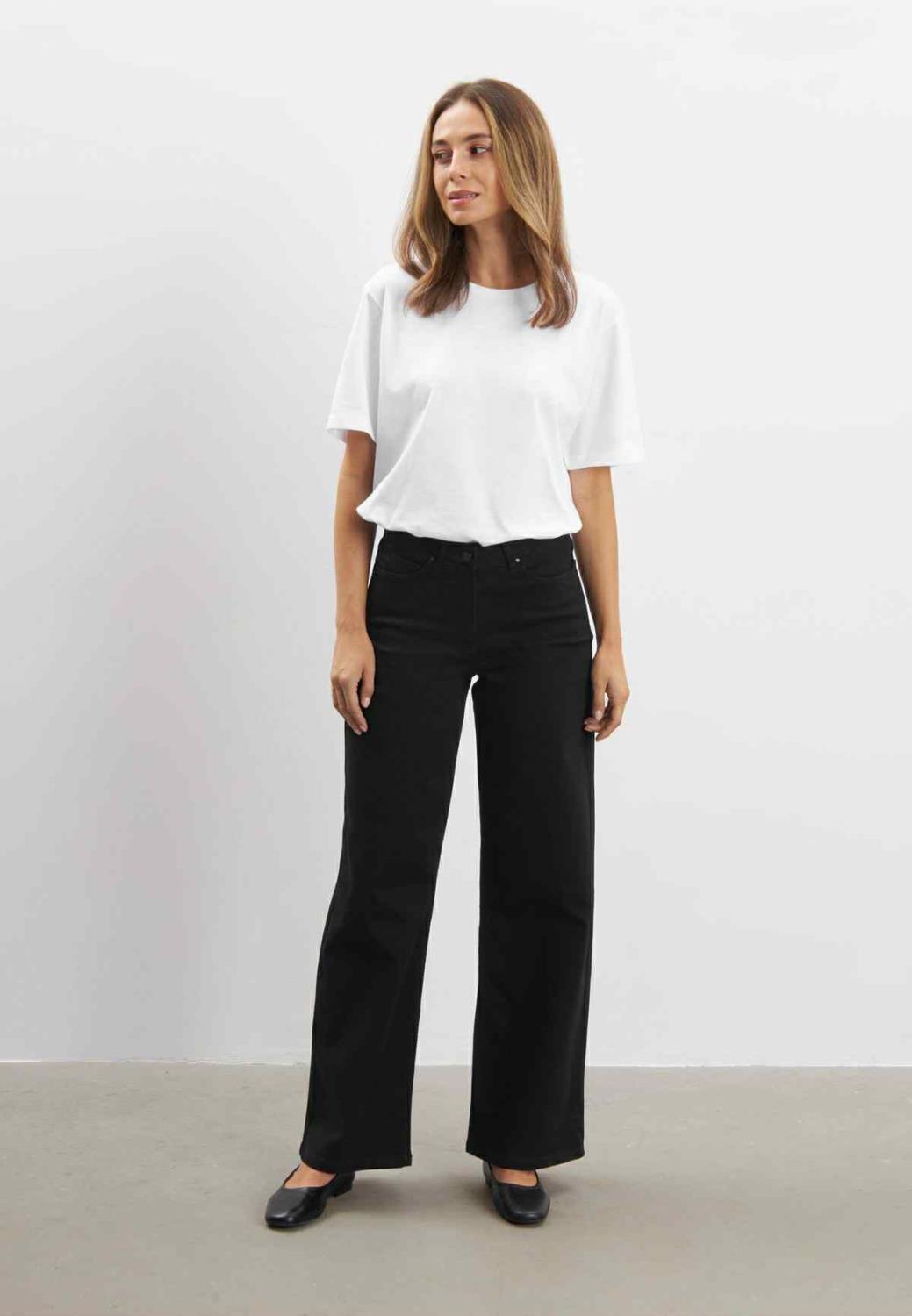5-lommers bukser med vide ben. Klassiske lommer foran, én myntlomme og klassiske baklommer. Fast midje, knapp- og glidelåslukking midt foran.