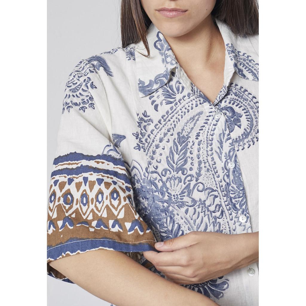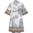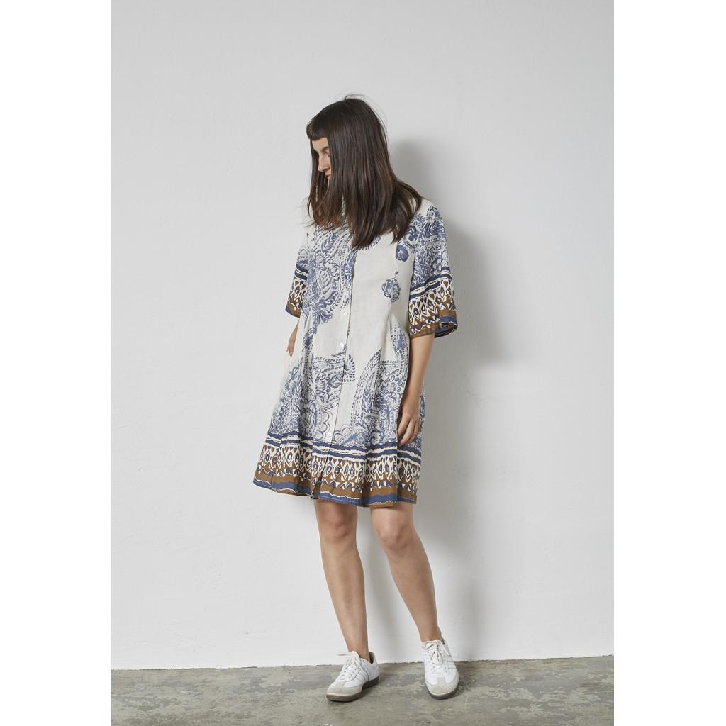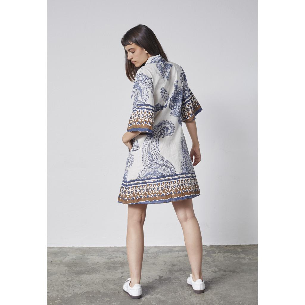 Kjolen har en klassisk passform, 3/4-lange ermer og et dekorativt trykk som tilfører et livlig og feminint preg. Enkel å style, den er et perfekt valg for varme hverdagsantrekk så vel som mer gjennomtenkte sommerlooks.