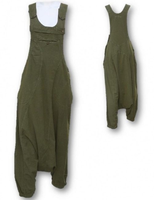 Tøff haremsbukse i kraftig vevd bomull. Justerbare skulderreimer, lomme på brystet, og knepping i sidene. Et røfft belte er sydd på frontstykket over en lomme. Alle knappene på buksa er laget av kokos. Buksa er sydd med kraftige dobbeltsømmer, og stoffet er slitesterk bomull i tettvevd og god kvalitet. Buksa har romslige lommer i siden. Siden skulderreimene er justerbare, er buksa enkel mht størrelse, men den er såpass lang at man bør være over 165 for at den skal se fin ut på.