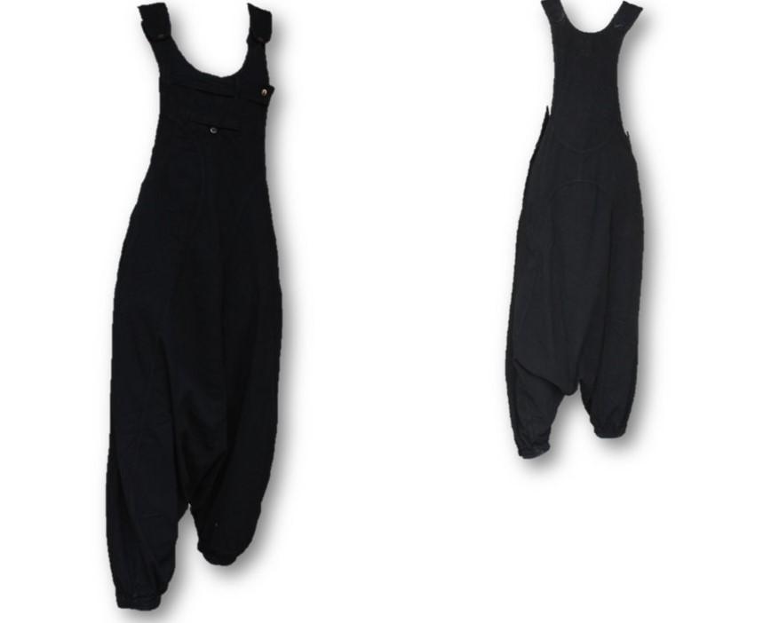 Tøff haremsbukse i kraftig vevd bomull. Justerbare skulderreimer, lomme på brystet, og knepping i sidene. Et røfft belte er sydd på frontstykket over en lomme. Alle knappene på buksa er laget av kokos. Buksa er sydd med kraftige dobbeltsømmer, og stoffet er slitesterk bomull i tettvevd og god kvalitet. Buksa har romslige lommer i siden. Siden skulderreimene er justerbare, er buksa enkel mht størrelse, men den er såpass lang at man bør være over 165 for at den skal se fin ut på.