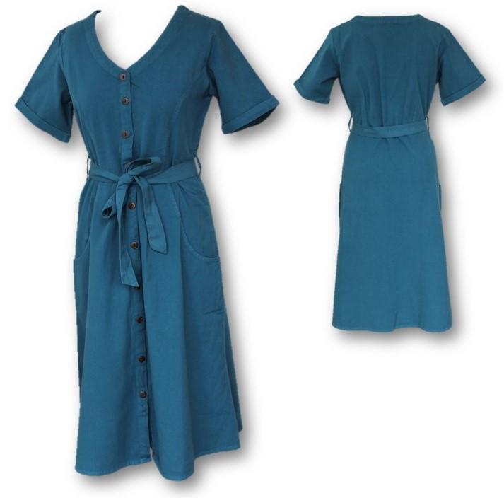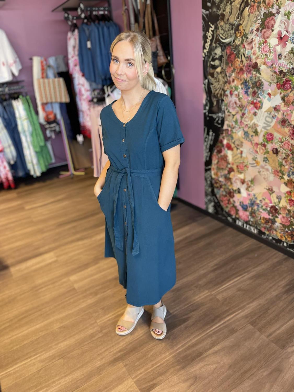 Tøff kjole med knappestolpe foran, lommer i siden. Det følger med belte man kan velge å knyte rundt livet, men også fin uten belte. En kjole man kan staile både til hverdags og fest.