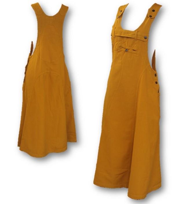Enkel og tøff selekjole i kraftig vevd bomull med lommer i siden. Justerbare skulderreimer, lomme på brystet og knepping i siden. Et røfft belte er sydd på fronten over en lomme, og alle knappene på kjolen er laget av kokos. Kjolen er sydd med kraftige dobbeltsømmer i slitesterk bomull i kraftig kvalitet.