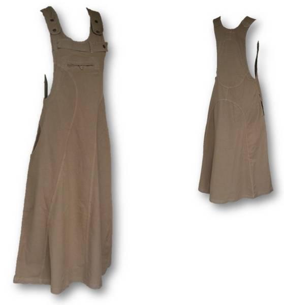 Enkel og tøff selekjole i kraftig vevd bomull med lommer i siden. Justerbare skulderreimer, lomme på brystet og knepping i siden. Et røfft belte er sydd på fronten over en lomme, og alle knappene på kjolen er laget av kokos. Kjolen er sydd med kraftige dobbeltsømmer i slitesterk bomull i kraftig kvalitet.