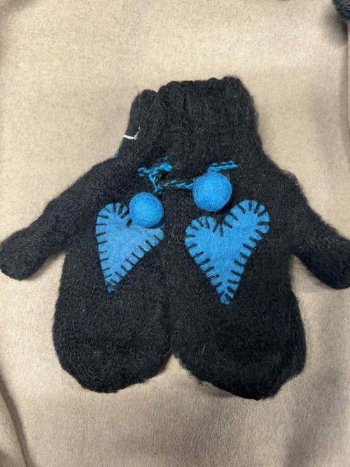 Håndstrikkede votter fra Nepal i børstet ull med fleecefôr,- disse holder godt på varmen også i vind og ruskevær.