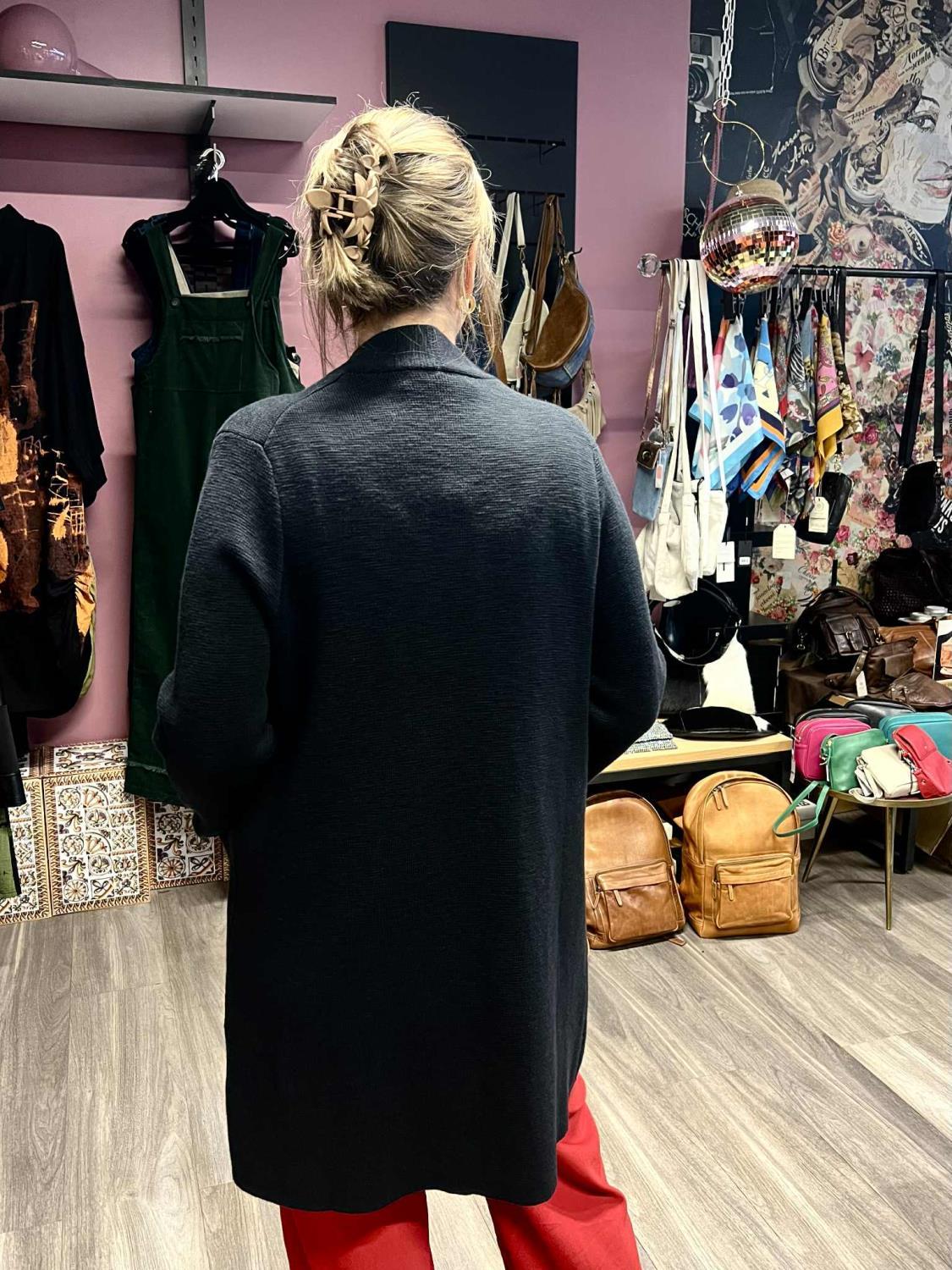 Fin enkelstrikket cardigan med skjulkte lommer i front. 100 % tykk bomullstrikk.