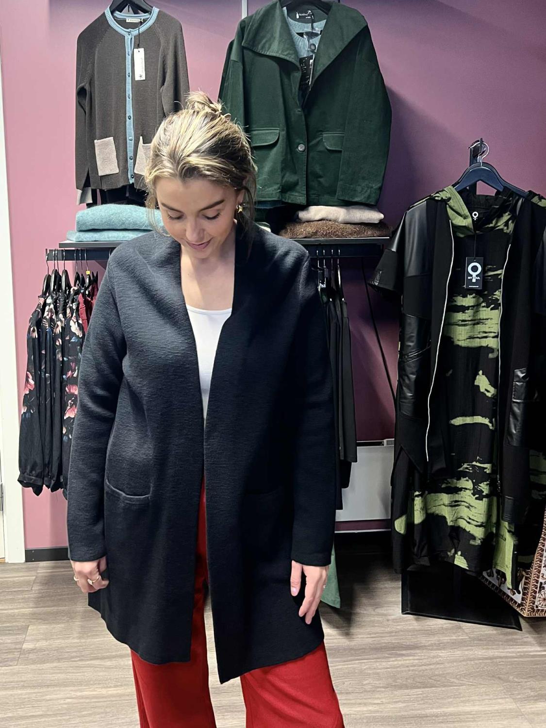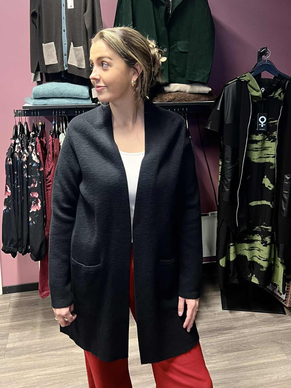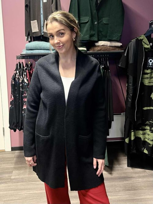 Fin enkelstrikket cardigan med skjulkte lommer i front. 100 % tykk bomullstrikk.
