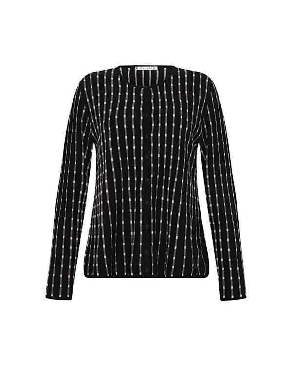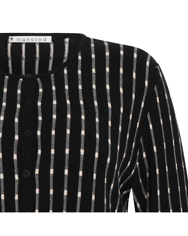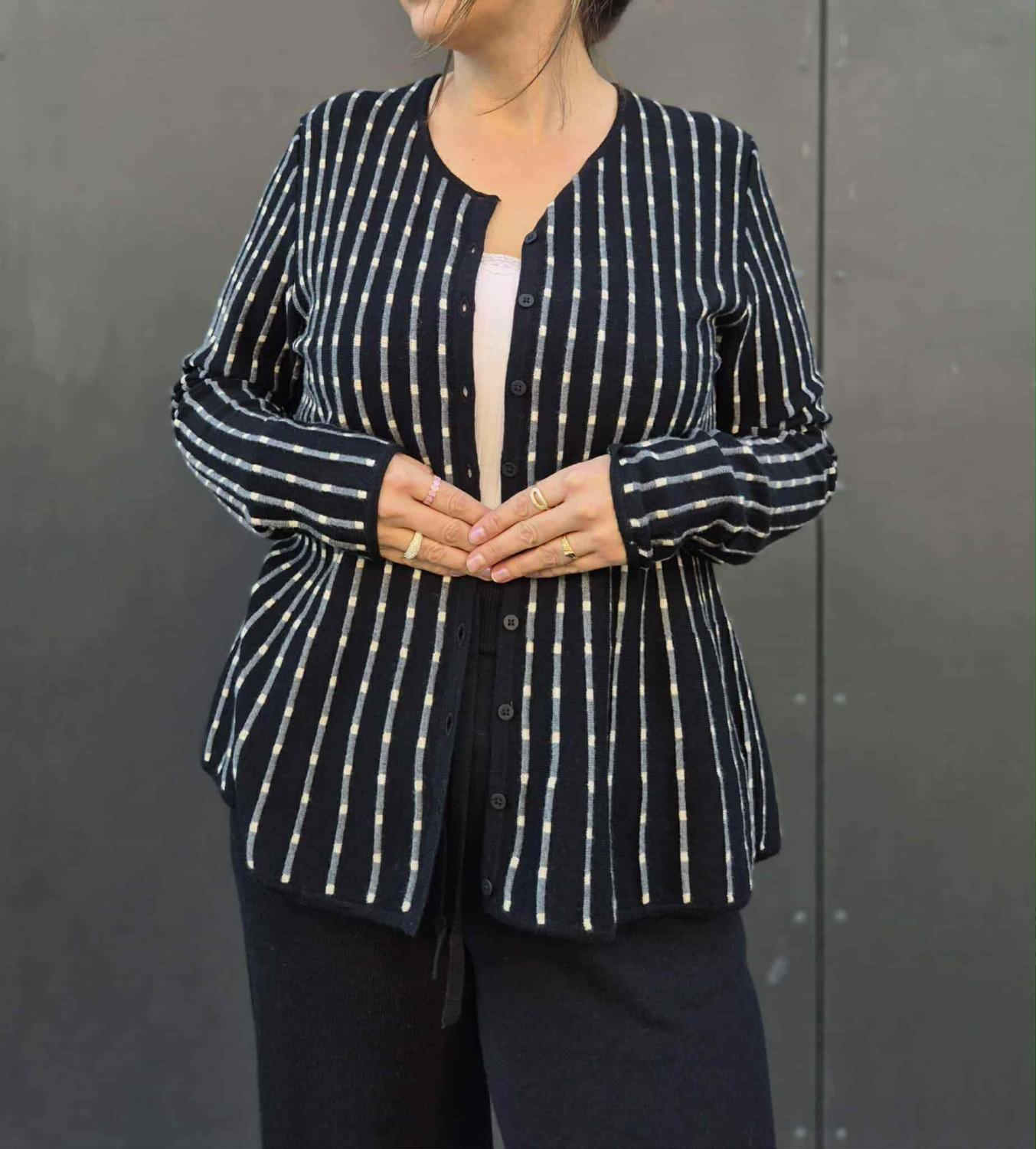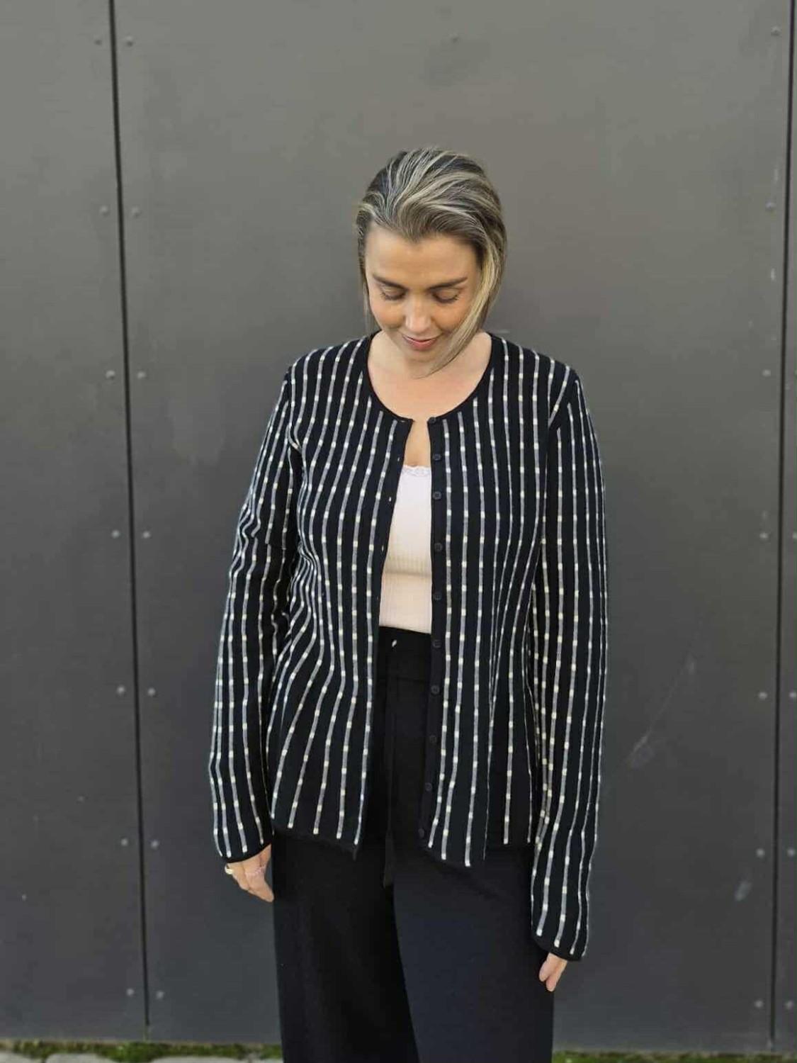 Detalj: vertikal stripe med liten prikk, cardiganen har agoya-skallknapp