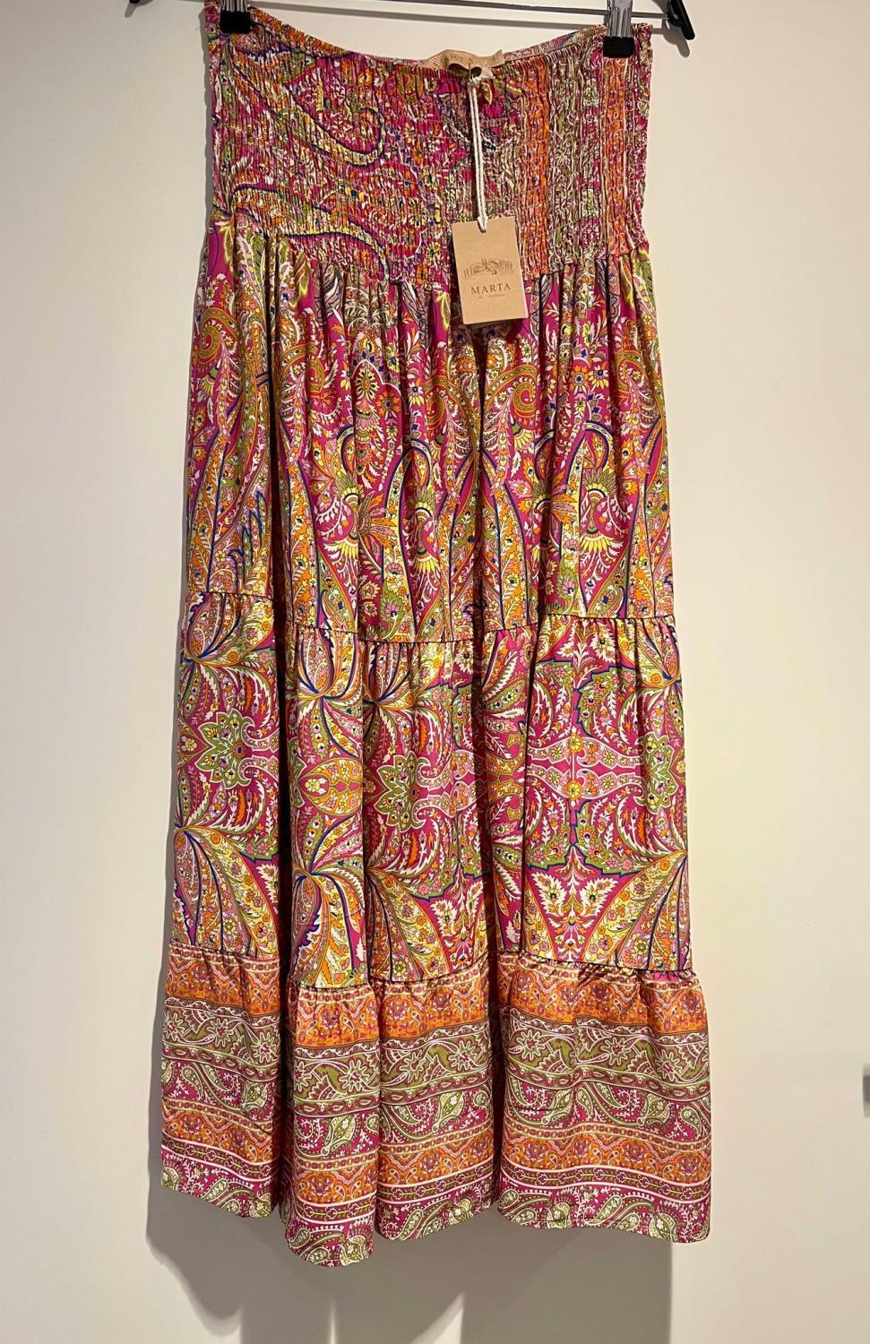 Lekkert kappeskjørt med bred vaffelstrikk i livet. Vakre farger og herlig mønster.