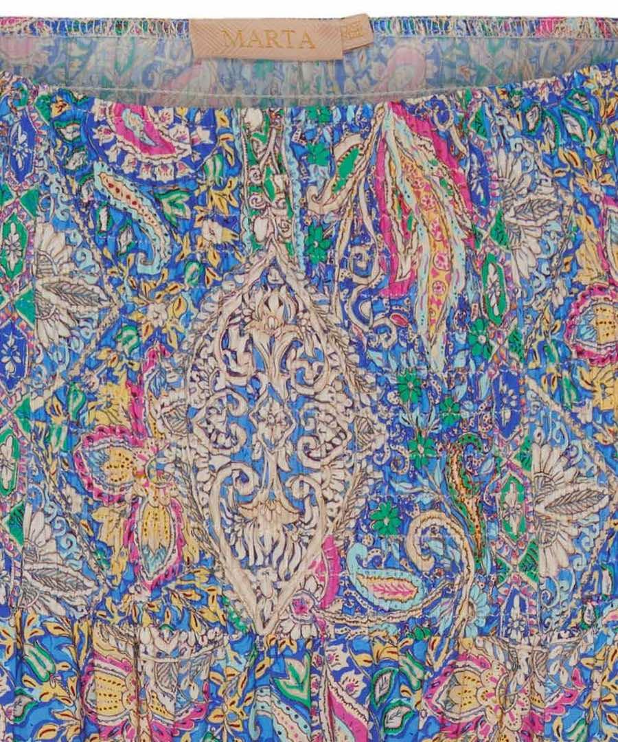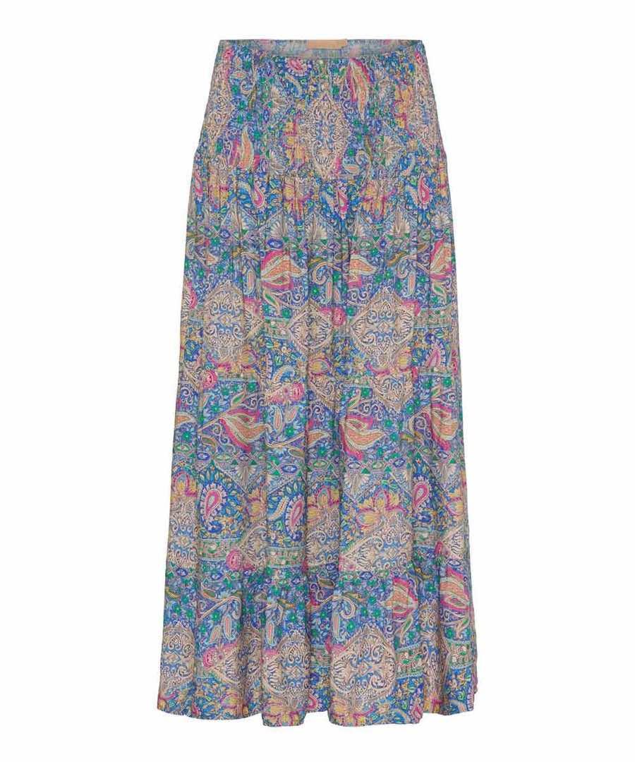 Lekkert kappeskjørt med bred vaffelstrikk i livet. Vakre farger og herlig mønster.
