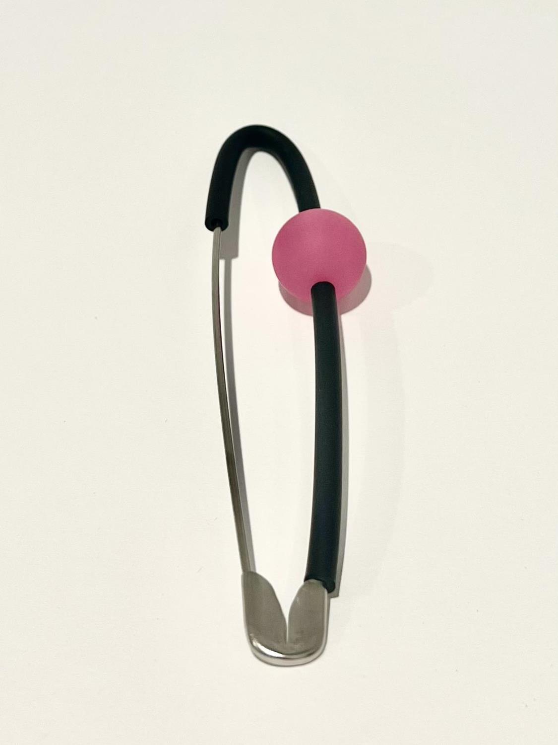 Stor sikkerhetsnål fra danske Marie. Nålen er i stål med sort gummi og farget kule i harpiks. Disse er supre og veldig praktiske til sjal, skjerf og jakker uten knapper.