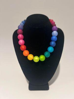 Lekkert smykke fra danske MARIE. Smykkene er håndlaget av fargede kuler i harpiks. Smykkene kommer i et hav av farger og spriter opp et hvert antrekk. Smykket er 43 cm (minste ring) og har en justerbar lås m/lenke på 6 cm. Nikkelfri