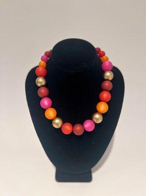 Lekkert smykke fra danske MARIE. Smykkene er håndlaget av fargede kuler i harpiks. Smykkene kommer i et hav av farger og spriter opp et hvert antrekk. Smykket er 43 cm (minste ring) og har en justerbar lås m/lenke på 6 cm. Nikkelfri