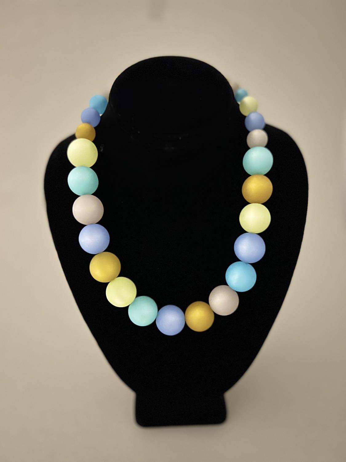 Lekkert smykke fra danske MARIE. Smykkene er håndlaget av fargede kuler i harpiks. Smykkene kommer i et hav av farger og spriter opp et hvert antrekk. Smykket er 43 cm og har en justerbar lås m/lenke på 6 cm. Nikkelfri