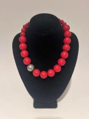 Lekkert smykke fra danske MARIE. Smykkene er håndlaget av fargede kuler i harpiks. Smykkene kommer i et hav av farger og spriter opp et hvert antrekk. Smykket er 43 cm (minste ring) og har en justerbar lås m/lenke på 6 cm. Nikkelfri
