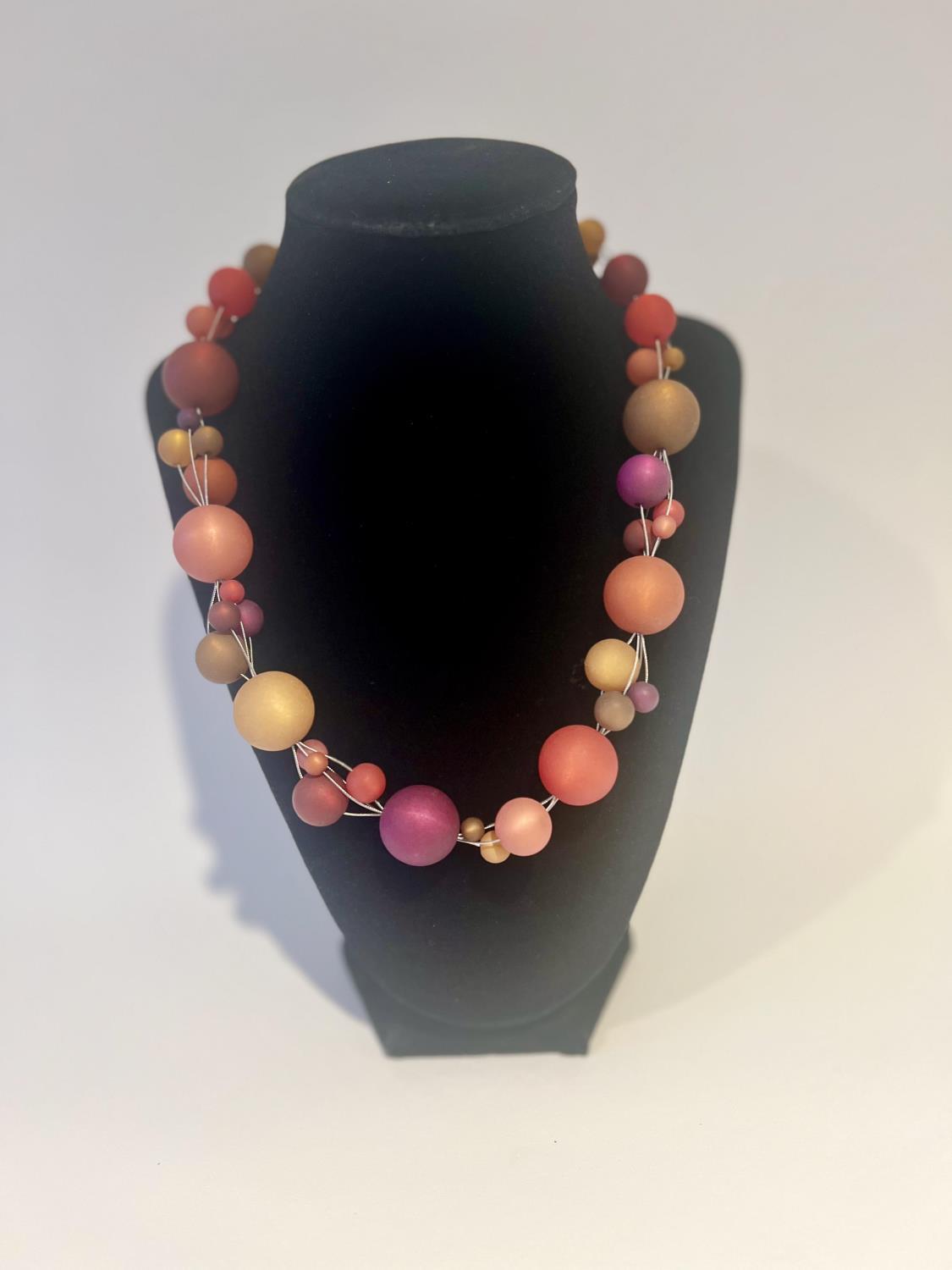 Lekkert smykke fra danske MARIE. Smykkene er håndlaget av fargede kuler i harpiks. Smykkene kommer i et hav av farger og spriter opp et hvert antrekk. Smykket er 43 cm og har en justerbar lås m/lenke på 6 cm. Nikkelfri
