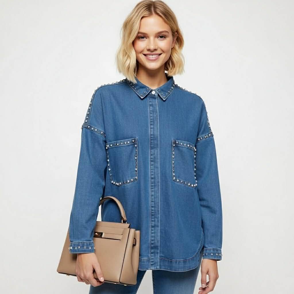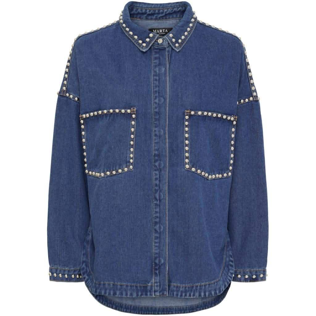 Sjekk denne tøffe skjortejakka i blå denim fra Marta du Chateau! Utrolig kul med nagler på ermer, lommer og skuldre. Store lommer i front, buet splitt nede og litt lengre bak.