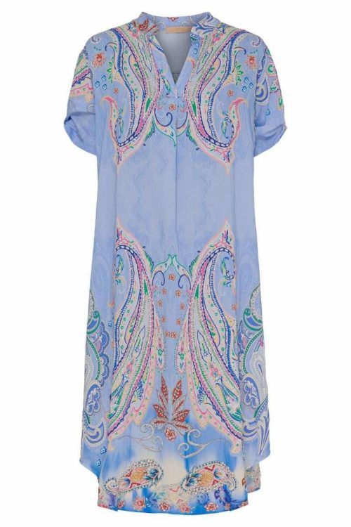 Vakker kjole med korte ermer og i det fineste print. Ermene kan brettes opp med en hempe. Nydelig blåfarge. Rett modell.