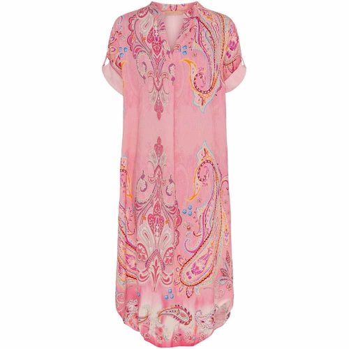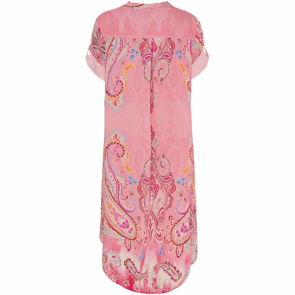 Vakker kjole med korte ermer og i det fineste print. Ermene kan brettes opp med en hempe. Nydelig rosafarge. Rett modell.